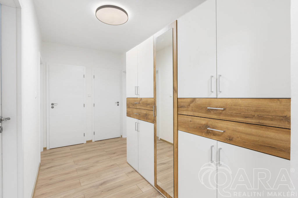 Byt disponuje praktickou šatnou, dostatkem úložných prostor a sklepem v suterénu domu. Pro maximální pohodlí je vybaven bezprůvanovou klimatizací a moderním osvětlením na dálkové ovládání. Byt se pronajímá částečně vybavený prostornou skříní ve vstupní hale a pračkou.