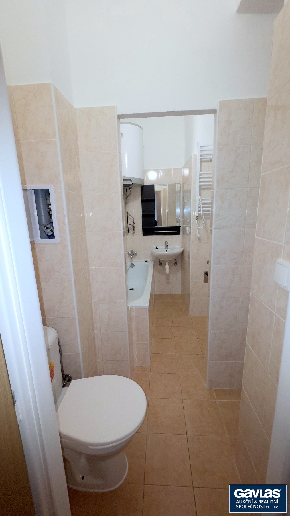 Koupelna je zařízena sprchou, umyvadlem, elektrickým bojlerem a místem pro připojení pračky. WC je vybaveno závěsnou mísou.