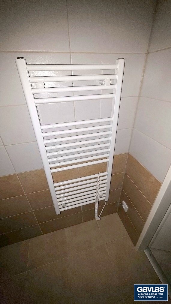 Koupelna je zařízena sprchou, umyvadlem a elektrickým topným žebříkem. V koupelně není místo pro pračku.