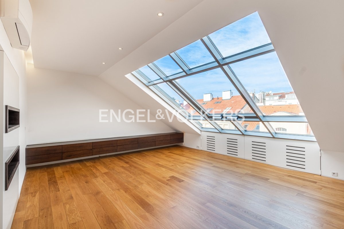 K pronájmu je k dispozici elegantní kompletně zrekonstruovaný penthouse s přímým vstupem z výtahu, umístěný v nejvyšším 6. nadzemním podlaží pečlivě renovovaného činžovního domu. Byt se vyznačuje třemi prostornými terasami, které jsou všechny orientované na jih a poskytují dostatek světla.