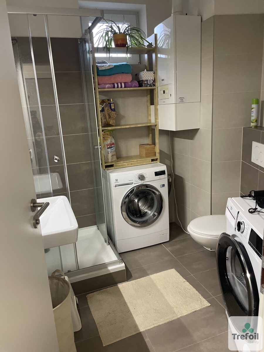 moderní koupelna se sprchovým koutem, WC a pračkou