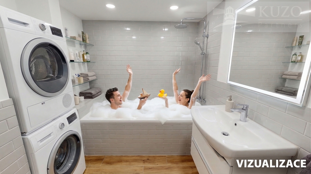 Kreativní dispozice: Nabízí se zde velmi oblíbená úprava – zvětšení koupelny na úkor zbytečně velkorysé chodby, čímž získáte moderní a vzdušné zázemí.