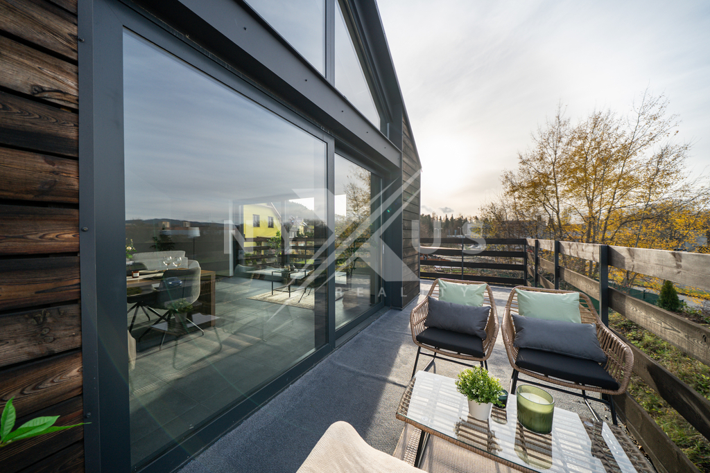 Menší jednotka o dispozici 3+kk má užitnou plochu 125 m² (včetně loftové galerie 18 m²) a k tomu terasu 30 m² umístěnou na zahradě.