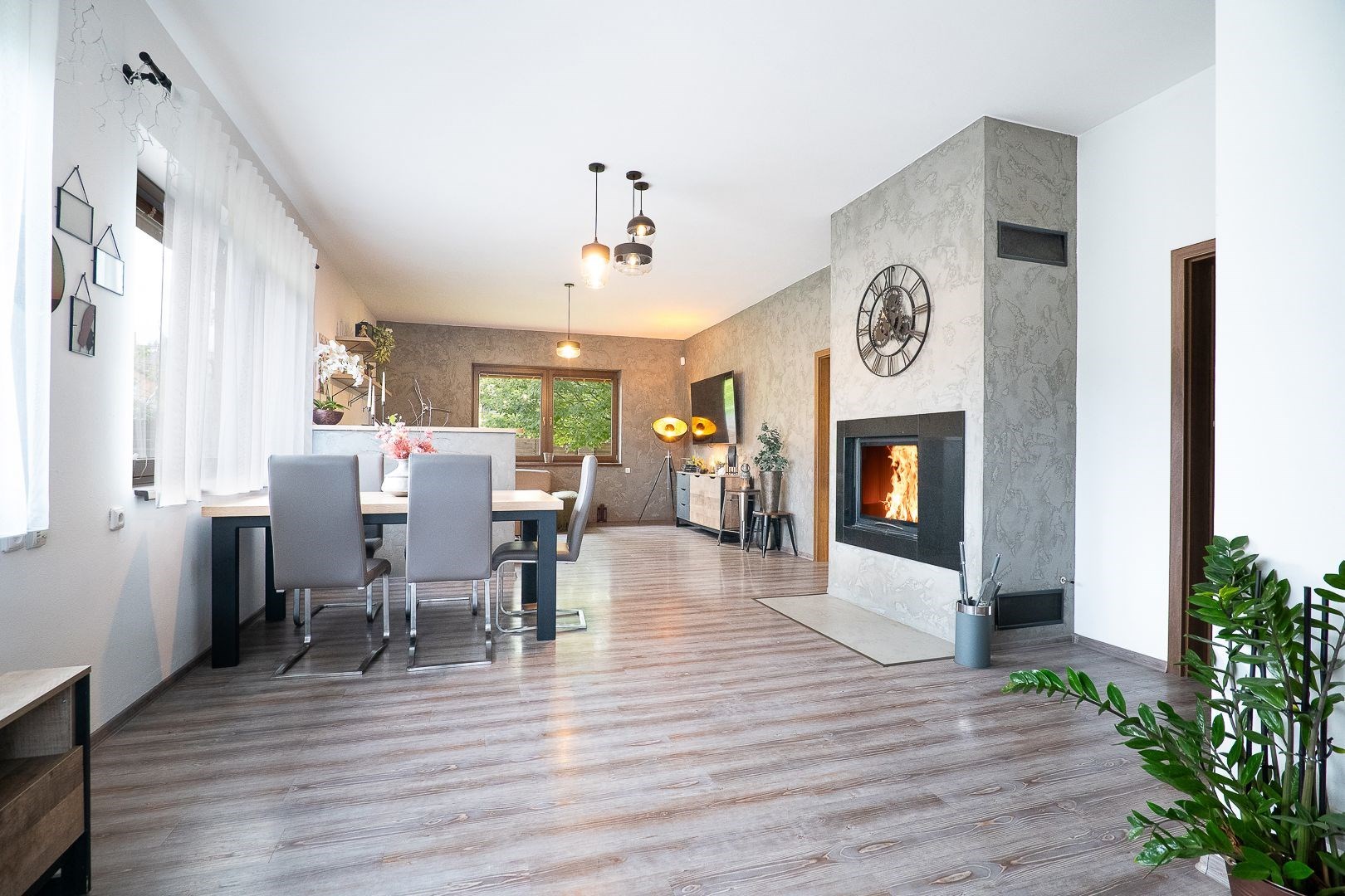 • prostorný obývací pokoj s jídelnou, krbem a vstupem na terasu,