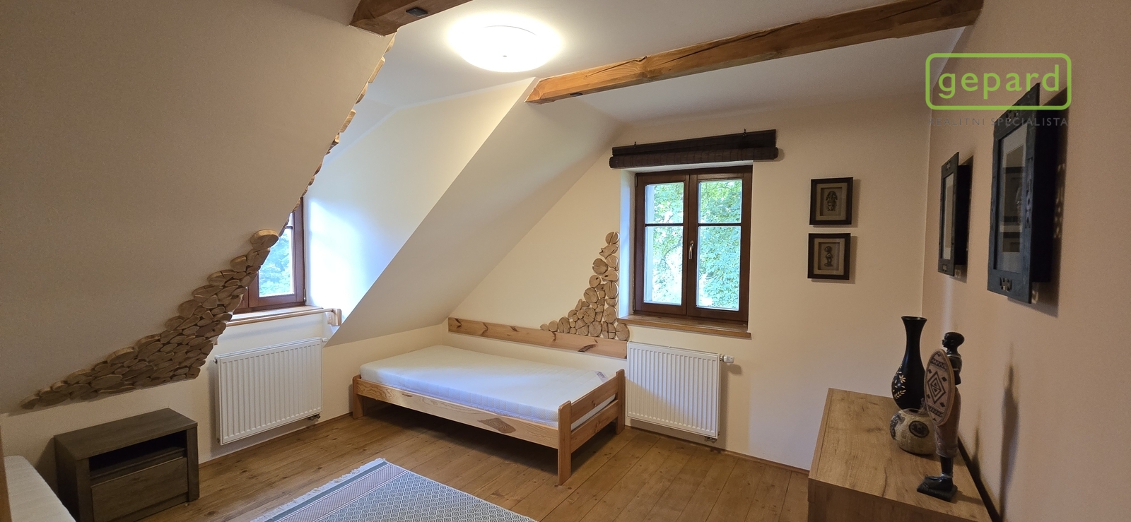 Dále posuvné dveře oddělující druhý byt se samostatným vstupem z protilehlé části domu, schodiště do patra, kde se z centrální chodby vstupuje do čtyřech podkrovních pokojům samostatné koupelny, malé kuchyně a technické místnosti.
