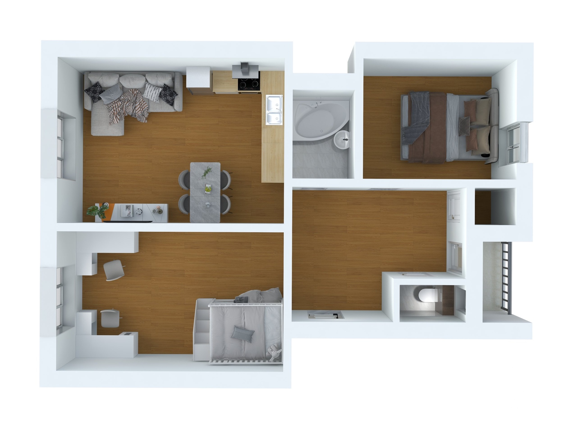 Příznivci Feng šui ocení pravidelný obdélníkový půdorys bytu, který je ideální pro klidné bydlení. Spojení kuchyně s obývacím prostorem umožňuje každodenní setkávání celé rodiny. Do jednotlivých neprůchozích pokojů se vchází z rozlehlé předsíně. Další pokoj může sloužit jako velkorysá ložnice nebo útočiště a vlastní ráj pro vaše děti. Pokoj s okny do zahrady je ideální volba pro ložnici rodičů. S obytnou plochou rozdělenou do samostatných místností a balkonem, nabízí tento byt ideální prostor pro Vaše každodenní potřeby.