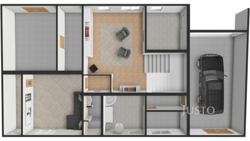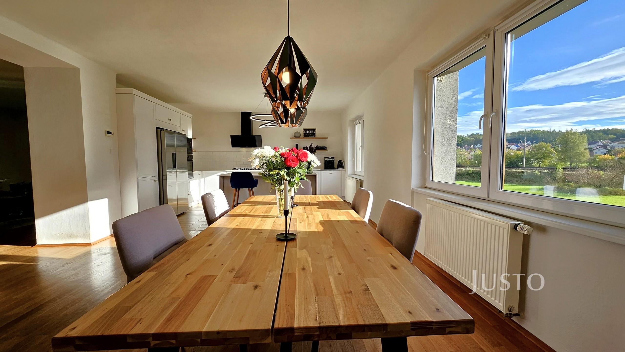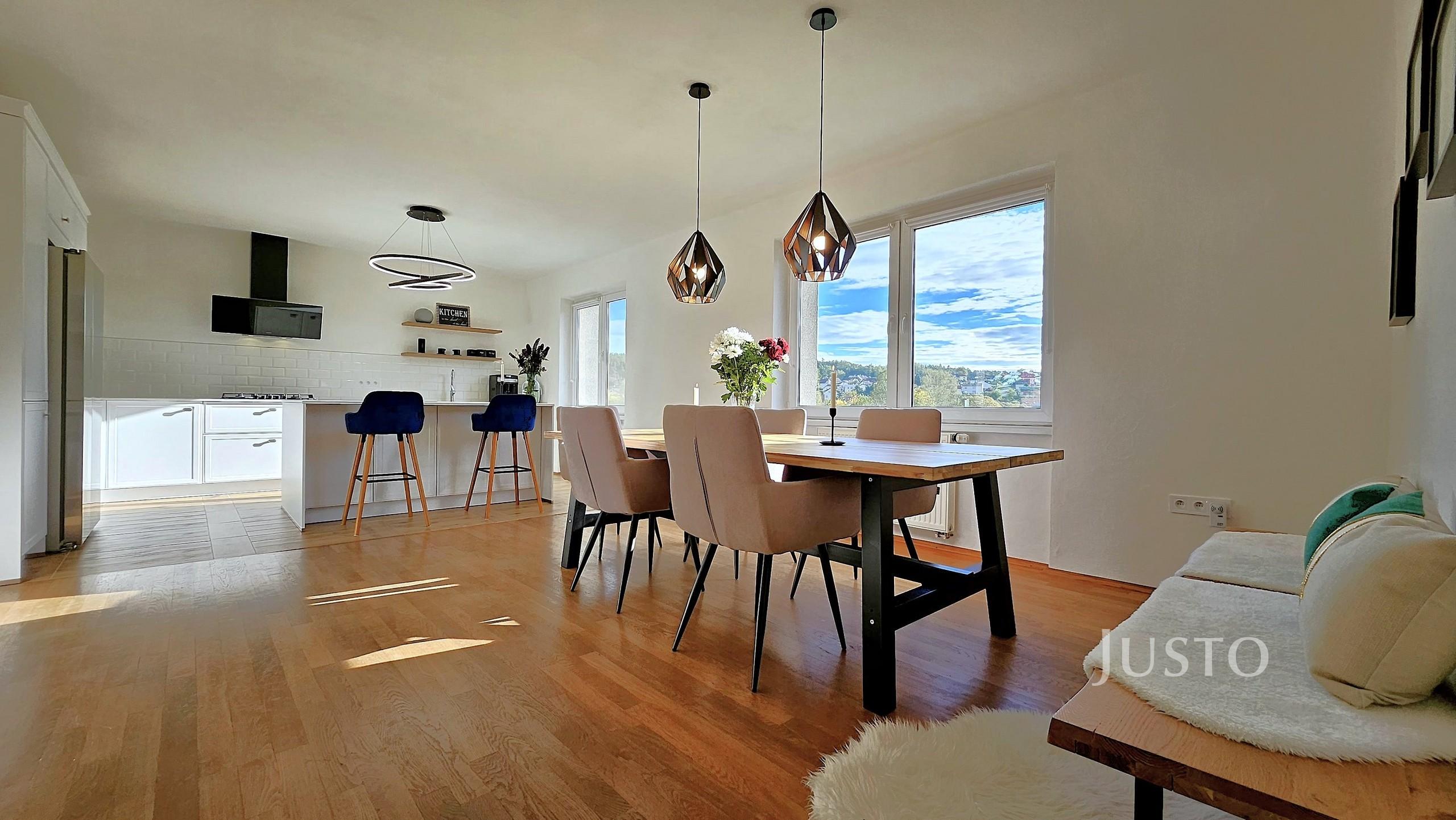 Dřevěným schodištěm se dostanete do 2. patra, kde najdete moderní kuchyň ve stylu Provence s ostrůvkem, velkým jídelním stolem a praktickou kuchyňskou linkou s dostatkem jak pracovního, tak úložného prostoru. Je to místo, kde bude celá rodina pohromadě, ale každý bude mít dost místa pro svoje aktivity. Na kuchyň navazuje obývací pokoj s výhledem do zahrady – ideální prostor pro lenošení.
