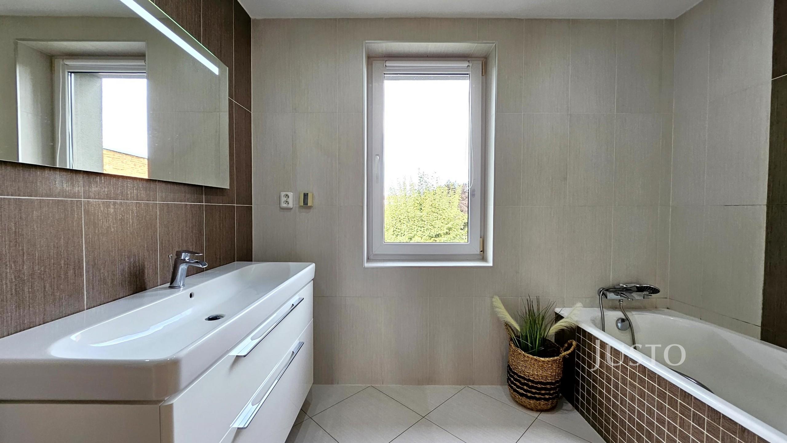V patře najdete tři další pokoje, včetně pracovny a průchozího dětského pokoje do ložnice se šatnou. Koupelna s vanou? Samozřejmě. A toaleta je zvlášť, protože někdy prostě potřebujete svůj klid.