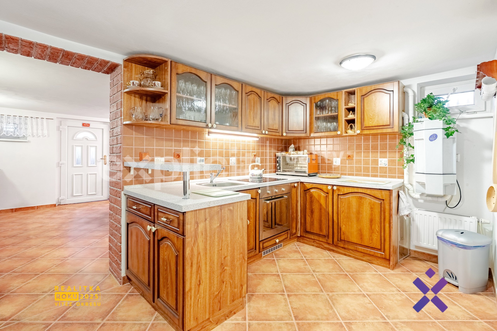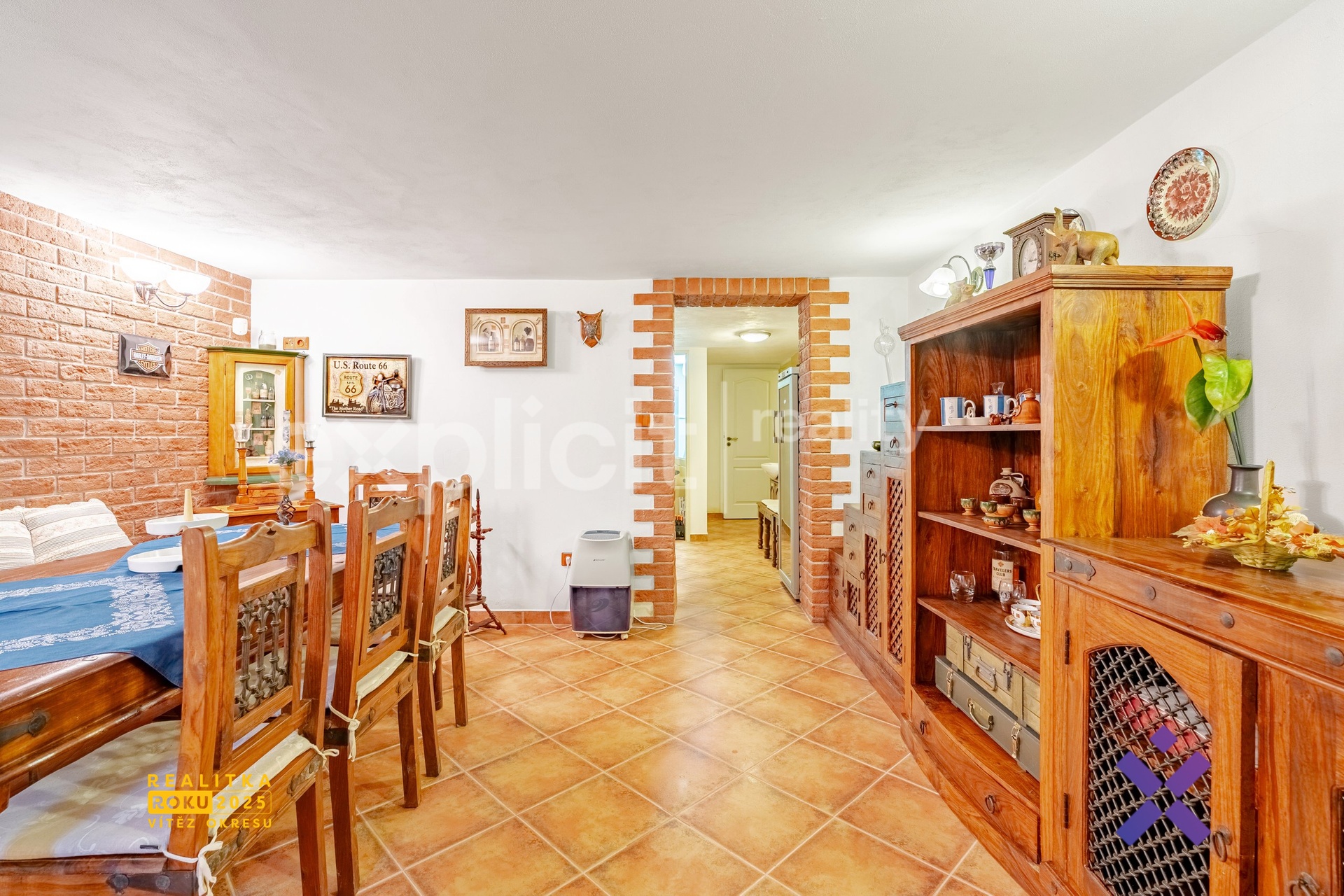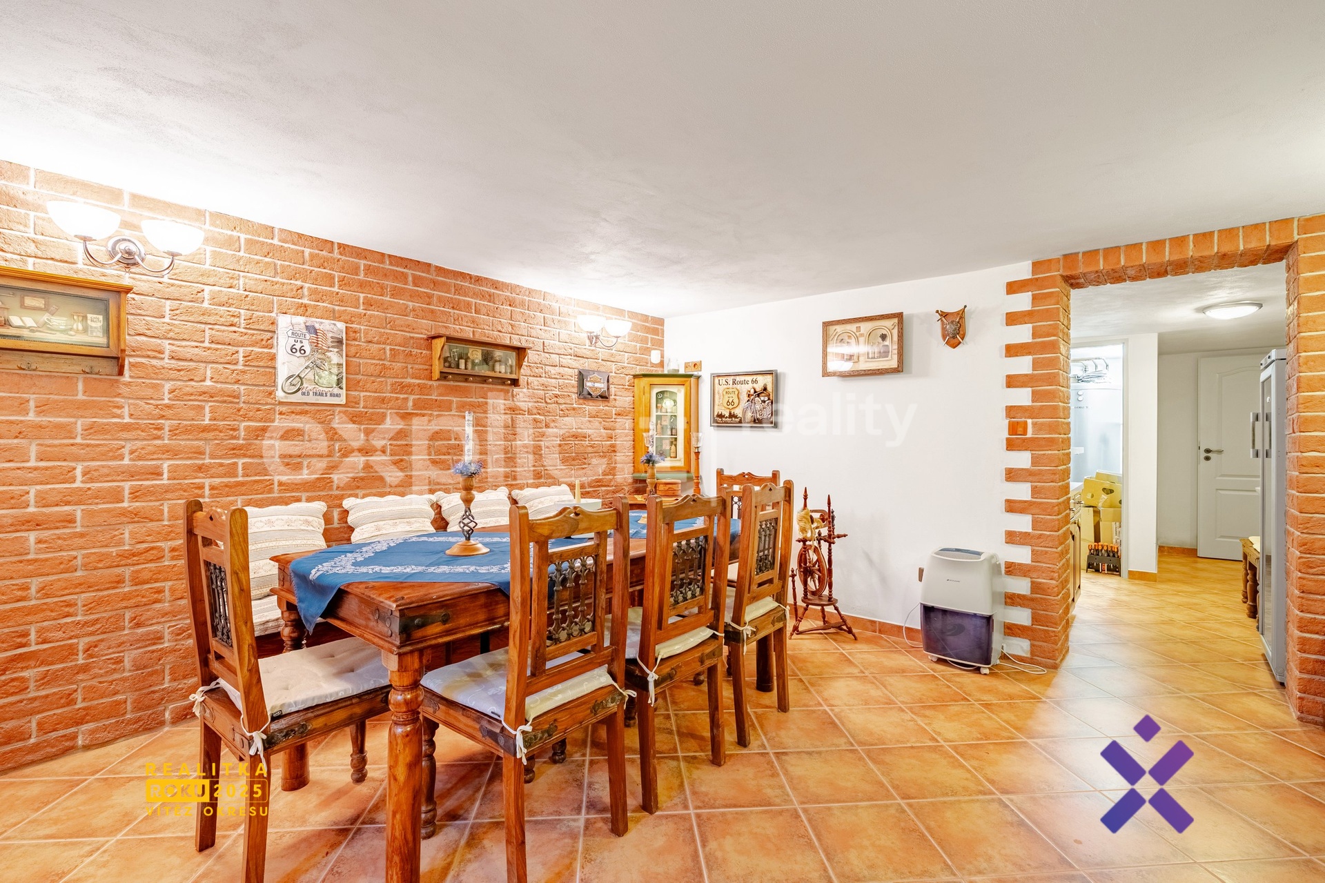 Dům nabízí také obytný suterén se samostatným vstupem, který je plně vytápěný a obyvatelný. Najdete zde stylovou společenskou místnost s velkým stolem a židlemi vhodnou pro rodinné oslavy, jako vinotéku nebo hernu. Na společenskou místnost navazuje kuchyňka s dřezem, troubou, indukční varnou deskou a lednicí. Součástí suterénu je rovněž chodbička s umyvadlem, samostatné WC a technická místnost.