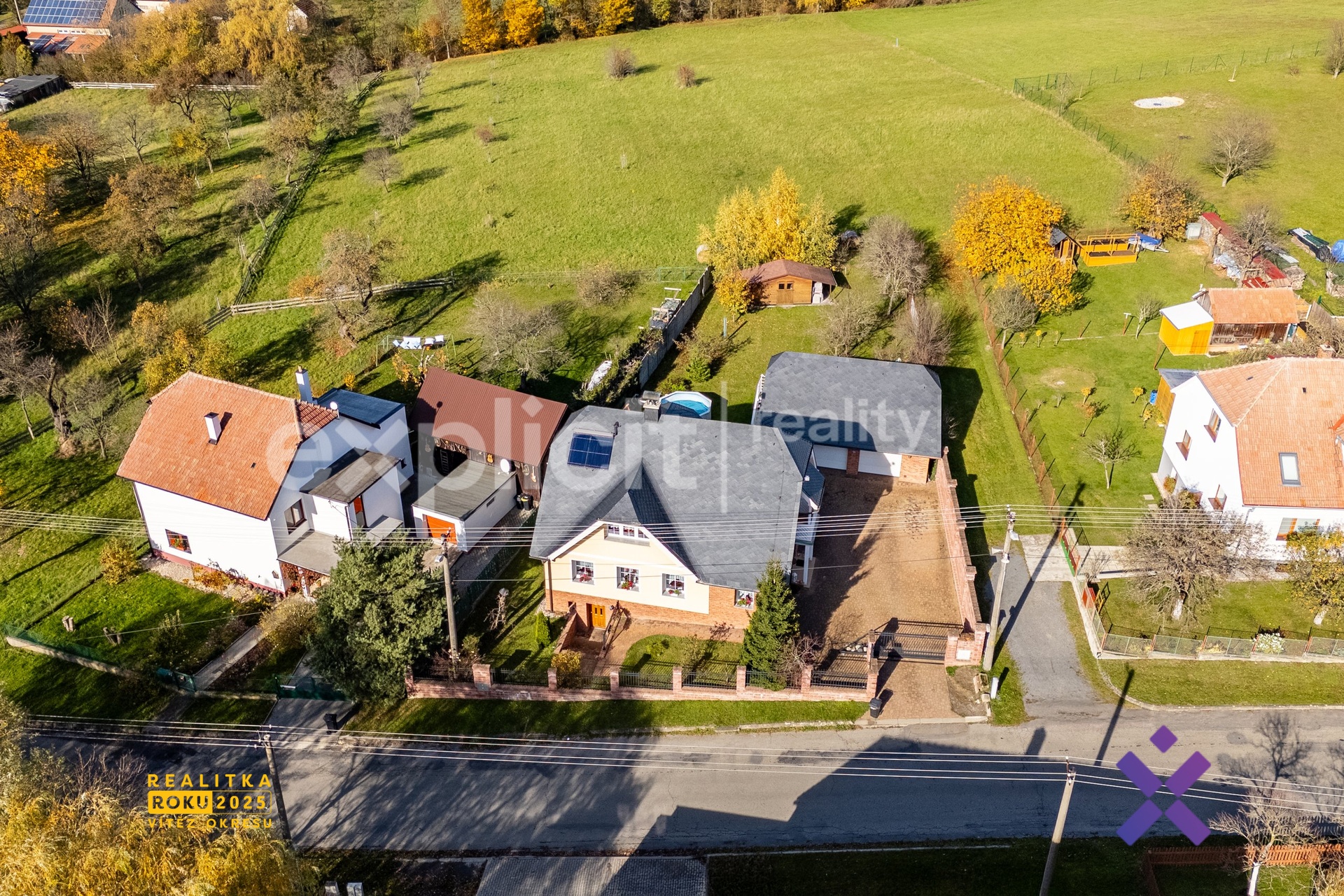 Za domem se rozprostírá udržovaná zahrada s bazénem, zahradním domkem a dvojgaráží. V podkroví dvojgaráže je vybudována společenská místnost s kulečníkem a sprchou, ideální pro přátele, relax nebo zábavu.