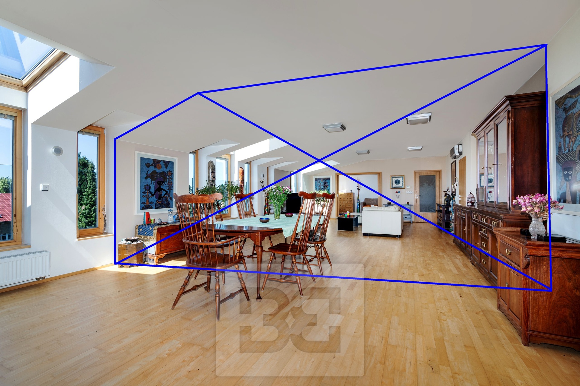 Prostorný, slunný byt o celkové ploše 135m2 se skládá z obývacího pokoje s kuchyňským koutem kompletně vybaveným značkovými spotřebiči, dále pak ze tří ložnic, koupelny s vanou, WC a sprchovacím koutem, samostatné toalety, vstupní haly a z technické místnosti. Byt je velice vzdušný a světlý díky střešním oknům ve všech místnostech. Obývací pokoj je situovaný směrem do ulice s krásným výhledem na náměstí/zámek. Součástí vybavení bytu jsou vestavěné skříně, klimatizace v každém pokoji, vstupní video-telefon.