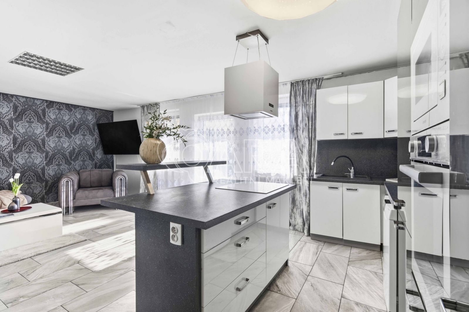 Druhou část domu o dispozici 3+kk tvoří obývací pokoj s kuchyňským koutem (cca 32 m2) a koupelnou s rohovou vanou a toaletou (cca 6 m2) a předsíň se schodištěm. Druhé nadzemní podlaží sestává ze dvou pokojů (cca 15,5 m2 a cca 17,5 m2)a koupelny se sprchovým koutem a toaletou (cca 6,2 m2). Ze dvou pokojů je vstup na společný balkon. V obývacím pokoji s kuchyňským koutem zavedeno podlahové vytápění, v ostatních prostorech instalovány radiátory.