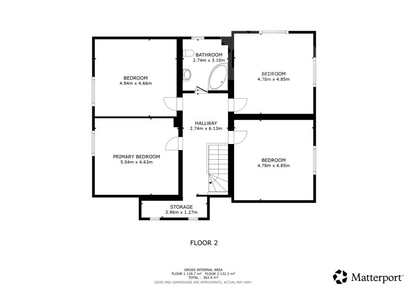 Patro - čtyři ložnice, koupelna s rohovou vanou a WC, komora.
