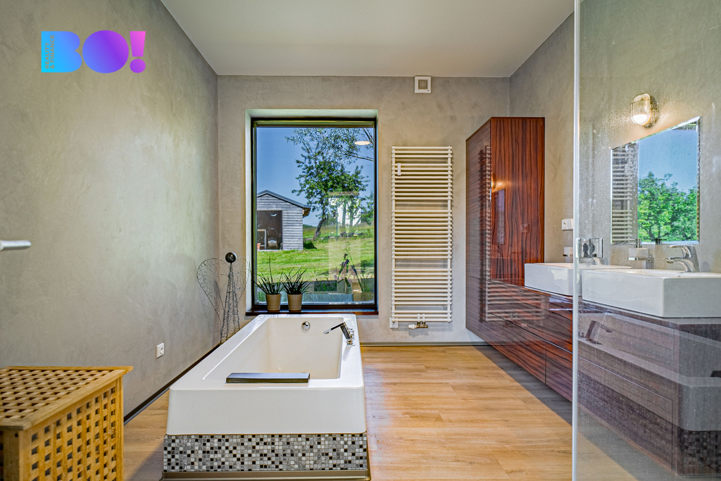 - hliníková okna s trojsklem – včetně velkoformátových francouzských oken v obytné části (hlavní portál s výhledem do krajiny má 8m na délku),