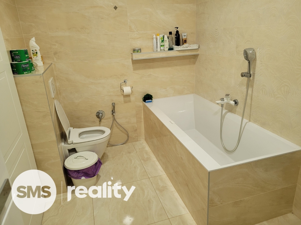 Dům se pyšní dvěma koupelnami, obě vybavené vanou, sprchou a WC, dále se zde nachází samostatné WC a prádelna s kotlem. Vytápění je řešeno tepelným čerpadlem typu země-voda a v obývacím pokoji jsou instalována kachlová kamna, což zajišťuje příjemnou atmosféru během chladných měsíců. Dům je vybaven podlahovým vytápěním, což přispívá k energetické efektivitě a pohodlí. Součástí domu je vlastní čistírna odpadních vod a retenční nádrž. Nemovitost je navržena jako bezbariérová, vhodná i pro osoby se sníženou pohyblivostí.