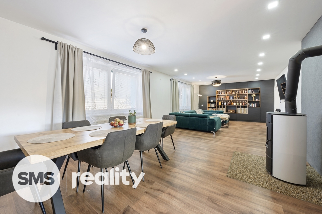 Obývací pokoj: prostorný, světlý, s krbovými kamny, které dodávají interiéru příjemnou atmosféru. Součástí je nadstandardní vestavná knihovna a pohodlný designový gauč.