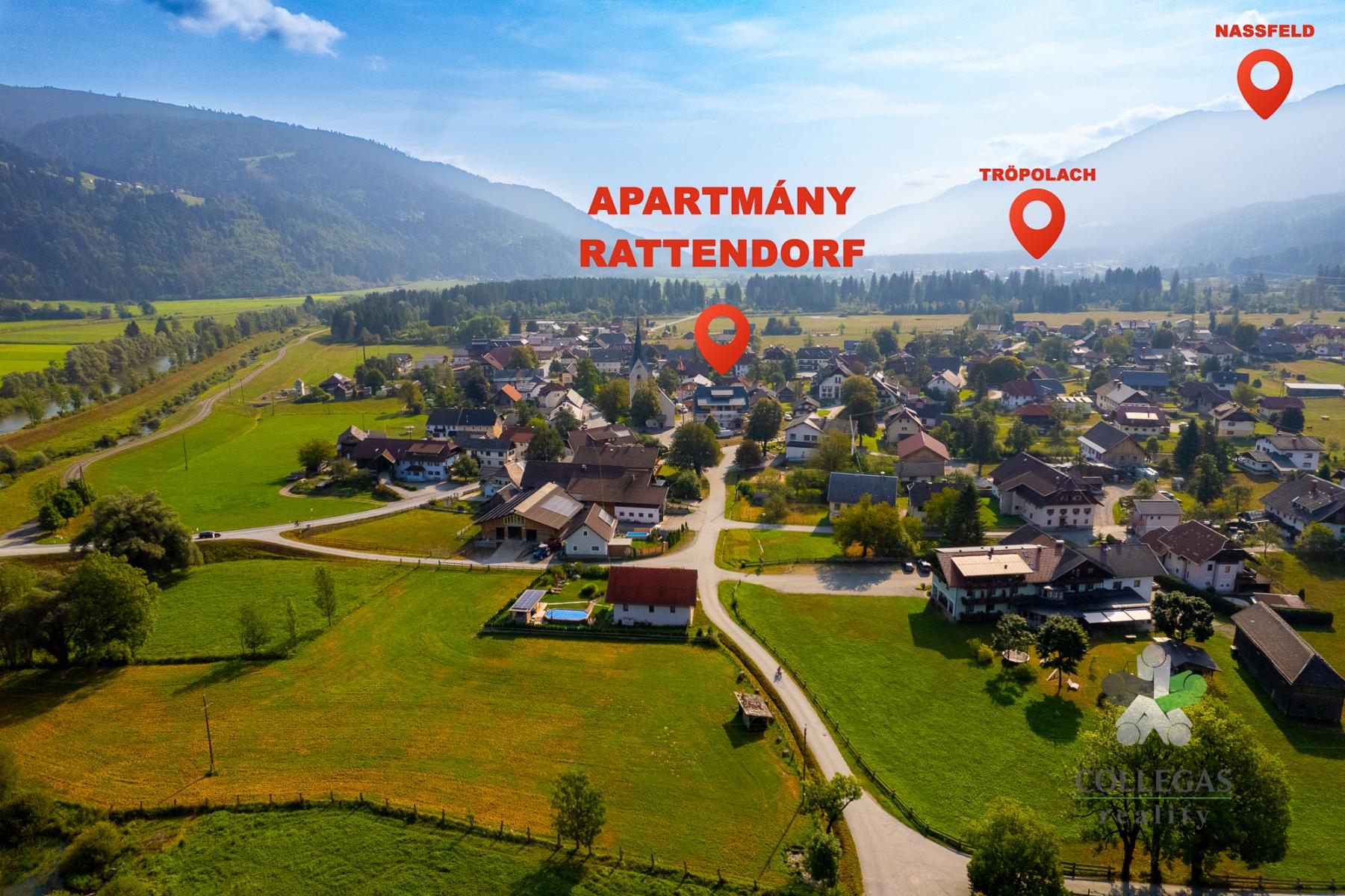 Vše je v samém centru alpské obce Rattendorf, která se nachází v údolí Gailtal v regionu Korutany v těsné blízkosti hranice s Itálií. Krásná alpská krajina láká turisty po celý rok a rodinná atmosféra vesnice je ideální pro ty, kdo hledají únik z městského ruchu. Oblast nabízí spoustu příležitostí pro relaxaci a wellness, výlety za historií či kulturou nebo gastronomické zážitky.