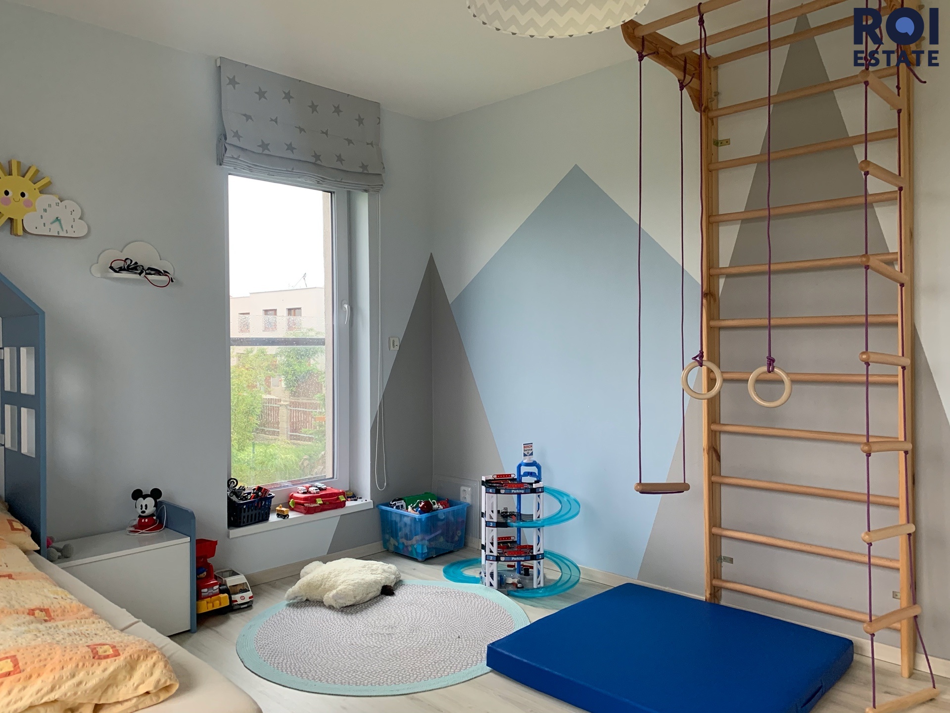 Koupelna nabízí jak vanu, tak sprchový kout, samozřejmostí je i samostatná toaleta. Do druhého patra vede elegantní dřevěné schodiště, které dodává interiéru charakter a útulnost. V horním patře se nacházejí čtyři samostatné pokoje, které lze využít jako ložnice, dětské pokoje nebo pracovny.