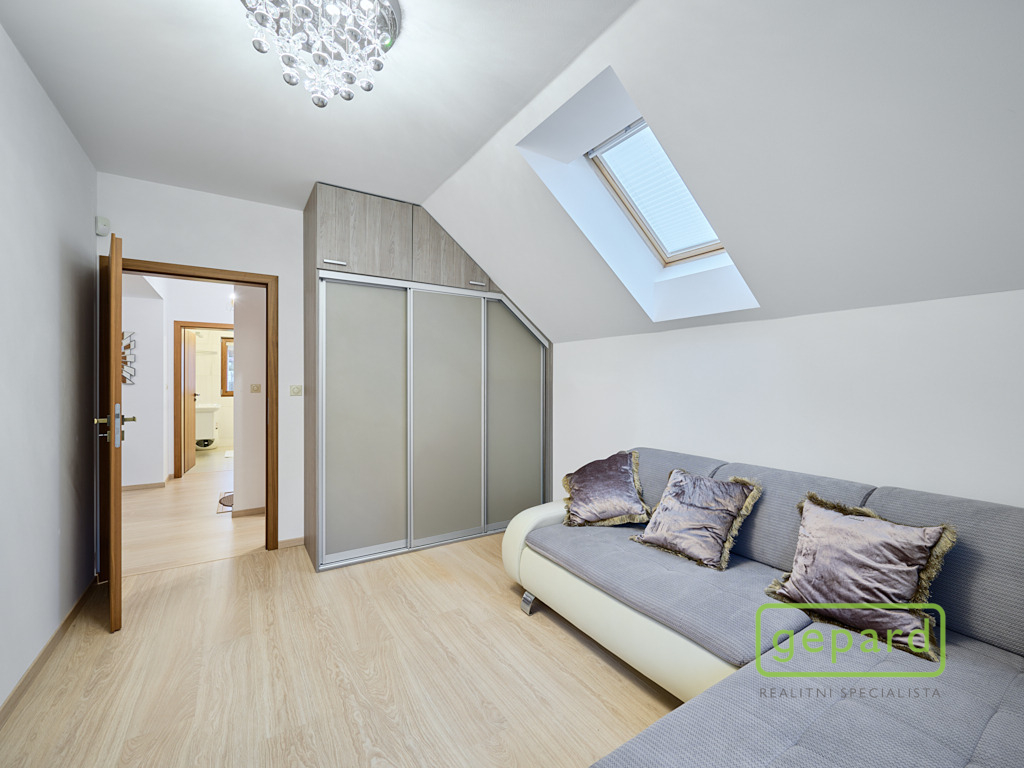 2/ RD patro (obytné podkroví): schodiště, hala, 4x pokoj, 2x koupelna, WC, šatník, 3x balkon, možnost využití pochozí půdy (vysouvací žebříkové schody).