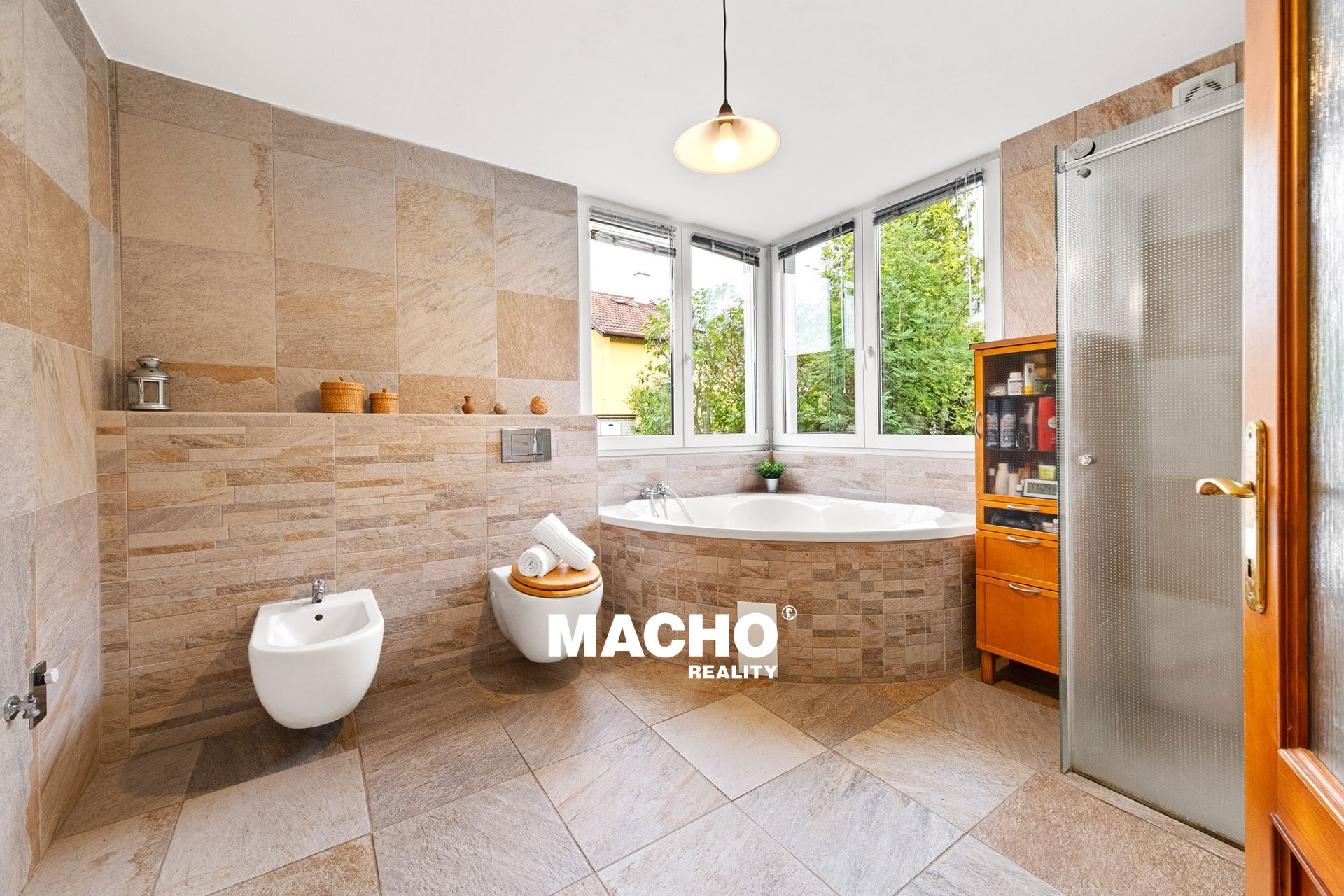 Dům o celkové podlahové ploše vč. příslušenství 333 m², disponuje dvěma bytovými jednotkami na třech podlažích. Je tak vhodný i pro vícegenerační bydlení. V 1. NP je samostatným bezbariérovým vstupem přístupná garsoniéra s kuchyňským koutem a koupelnou s vanou a toaletou. Dále se na podlaží nachází garáž pro tři vozy, technická místnost a z venku přístupný sklep. 2. NP zahrnuje předsíň, prostorný pokoj s krbovými kamny, obývací pokoj s kuchyňským koutem a přímým vstupem do zimní zahrady, velkou šatnu a koupelnu s rohovou vanou, sprchovým koutem, toaletou a bidetem. 3. NP nabízí ložnici, dva pokoje a koupelnu s vanou a toaletou.