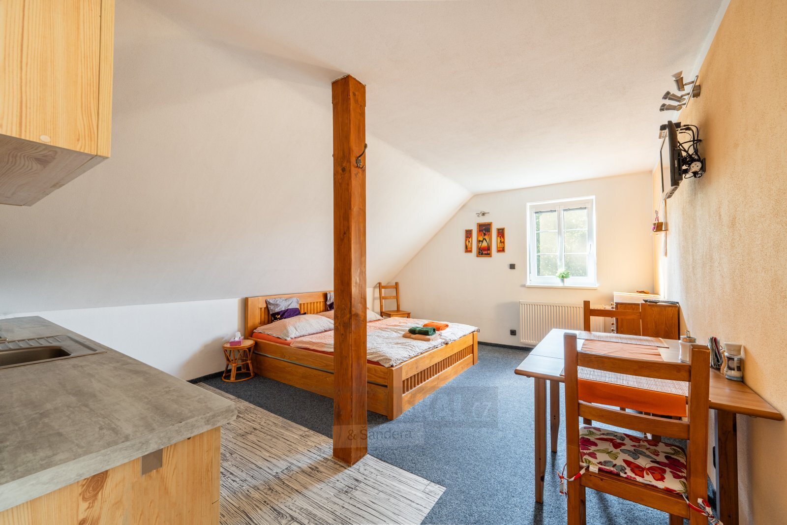 Dětský pokoj, pokoj s kuchyňkou a koupelna se sprchou a WC.