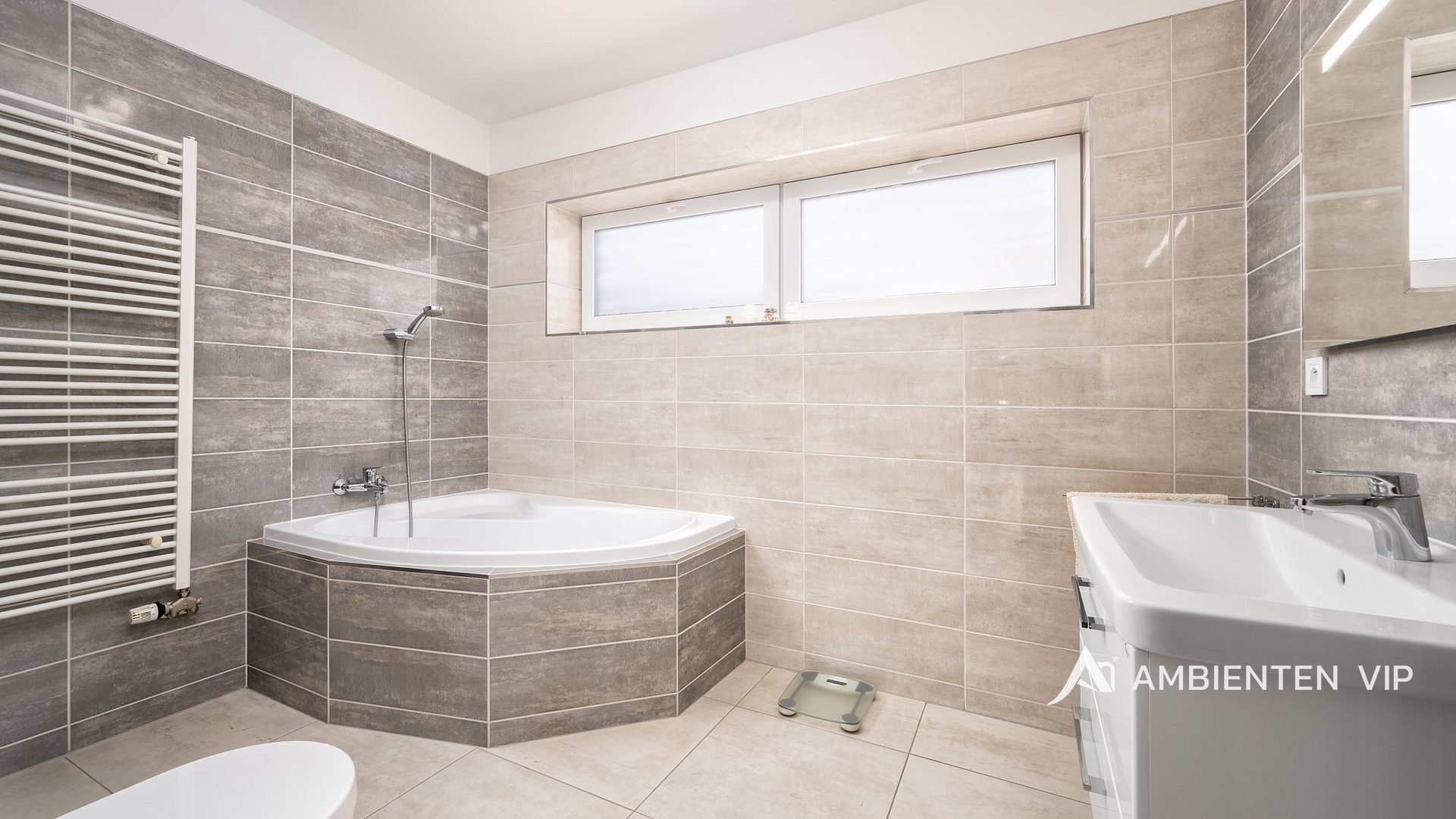 Zádveří domu vás nadchne svojí vzdušností, jelikož je velice prostorné. Spojovací chodba vás zavede přímo do otevřené dispozice kuchyně, jídelny a obývacího pokoje s přímím stupem na terasu a do zahrady. Dominantou obývacího prostoru jsou francouzská okna s výhledem do jižně orientované zahrady odstíněné od sousedních pozemků zelení a stavebními prvky. Na zahradě můžete relaxovat na terase, kterou lze v teplých měsících pojmout jako venkovní jídelnu díky přímému napojení na kuchyňský kout. V blízkosti kuchyně je prakticky umístěna technická místnost s toaletou, umyvadlem a zákoutím pro pračku. V 1 NP se nachází tři ložnice, koupelna a technická místnost. Dvě ložnice mají orientaci směrem do zahrady a jedna směrem do ulice. V technické místnosti se nachází plynový kotel a je zde i příprava pro pračku. Jižní orientace ložnic dodává pokojům dostatek denního světla a uklidňující výhledy do zahrady. V 1 NP je dále šatna na míru s dostatkem úložných prostor. V rámci koupelny se nachází vana, sprcha, umyvadlo a toaleta s bidetovou sprškou. Zdivo nemovitosti je pálená cihla a dům je zateplen. Vytápění domu zajišťuje plynový kotel spolu s tepelným čerpadlem. V přízemí domu je podlahové vytápění po celé podlahové ploše, v patře pak v koupelně. Okna jsou plastová s izolačním trojsklem, do zahrady osazena venkovní elektrickou žaluzií. Celkové měsíční náklady na provoz domu včetně místního internetu činí v průměru 4000,- Kč. Velkou výhodou domu jsou solární panely v záruce, které v letních měsících výrazně snižují náklady na ohřev vody. Nemovitost je v perfektním technickém stavu, prakticky a vkusně zařízena a nevyžaduje žádné nutné investice. K dispozici je dům po dohodě s majiteli.