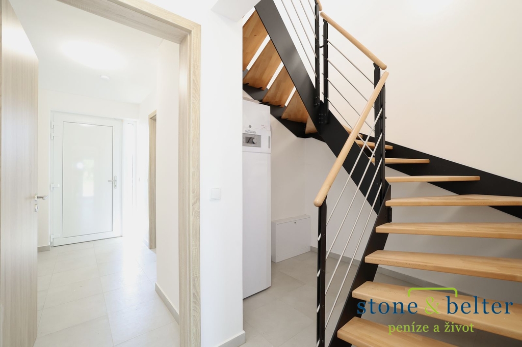 K dlouhodobému pronájmu nabízíme novostavbu rodinného domu 4+kk + pracovna v ul. U Nučického nádraží v Rudné u Prahy o velikosti 110 m² se zahradou 344 m² (pozemek celkem 516 m²). Jde o krajní stavbu řadového trojdomu. V přízemí naleznete prostorný obývací pokoj s výstupem na terasu a zahradu, kuchyňský kout, pracovnu a koupelnu se sprchou a WC. Ve 2. NP jsou 3 pokoje a koupelna s vanou a WC.