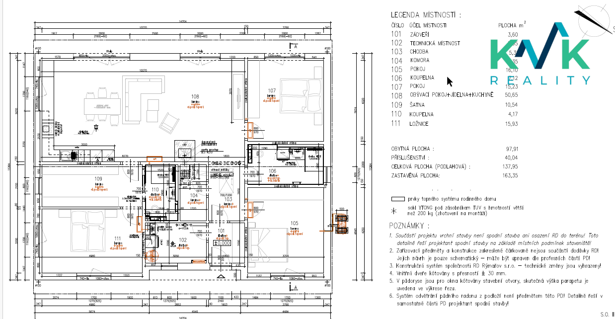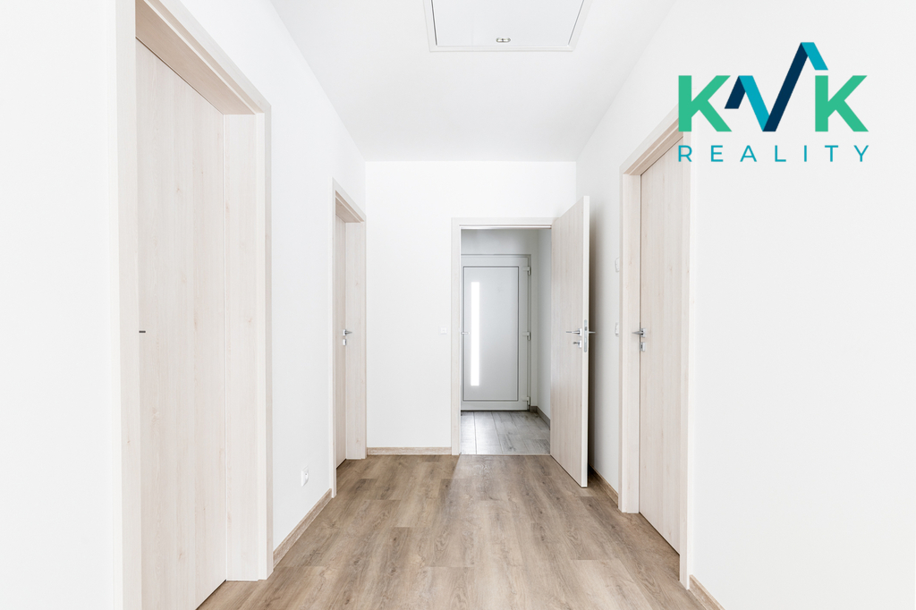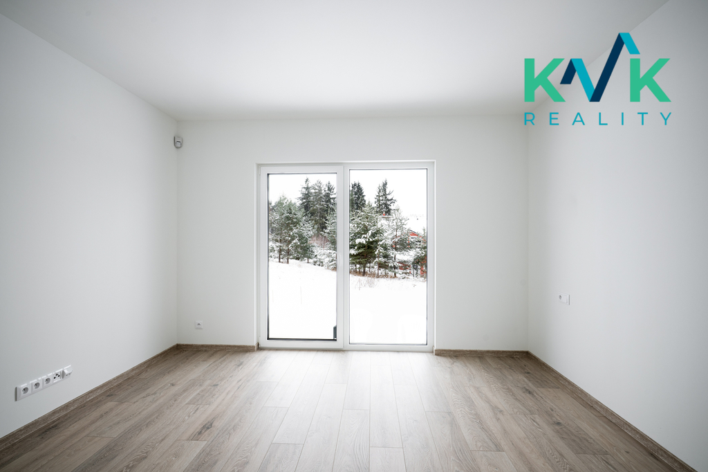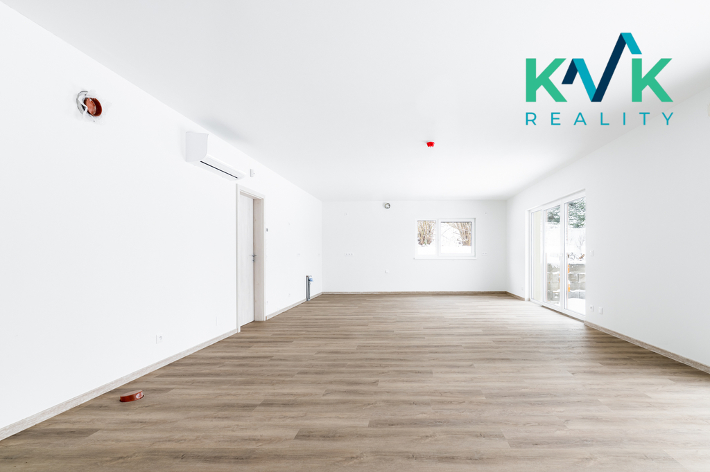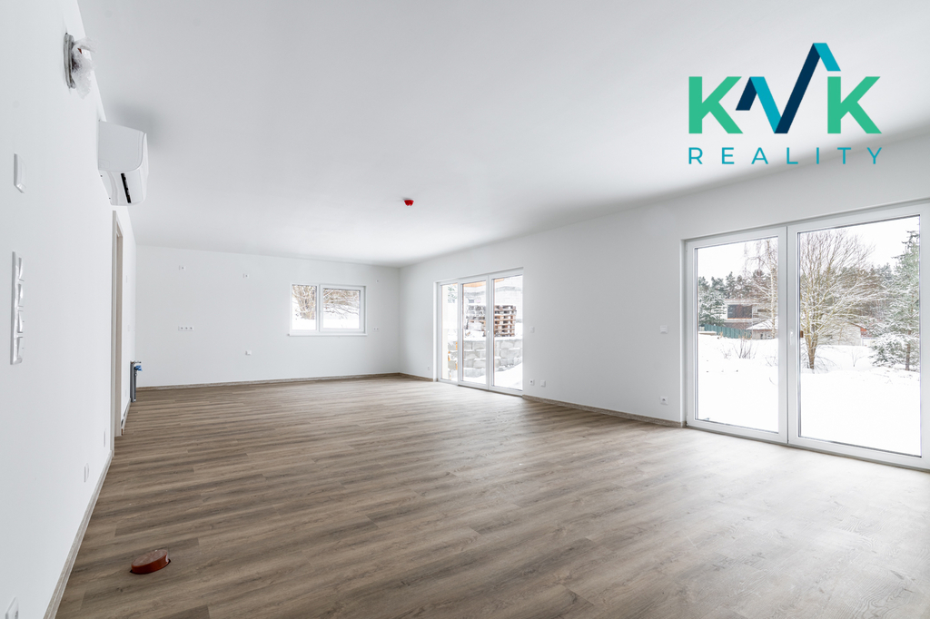 Dům 4kk s užitnou plochou 160 m2 je řešen prakticky, vybaven kvalitními materiály a moderními technologiemi. Splňuje nároky na energetickou úspornost s certifikací A. Dispozice této nemovitosti je řešená velmi intuitivně. Z předsíně se po pravé straně nachází technická místnost, kde je srdce domu se zabudovanou fotovoltarikou jako zdroj tepla a také bojler. Vedle se nachází spíž pro uložení potravin. Naproti je první pokoj, který sousedí s koupenou. Dále po pravé straně poskytuje pohodlí s výhledem do zahrady druhý pokoj. Společenská místnost s krbovými kamny (výkon 12-14 kW), klimatizací a prostorem pro kuchyňskou linku je situovaná na jižní stranu. Celý tento prostor má dva vstupy na zahradu. Podlahy ve společenské místnosti jsou pokryté vinylem o tloušťce 1 cm, v ložnicích se projdeme po laminátu o tloušťce 1 cm a v technických místnostech se nachází dlažba. V celém domě je položeno pro podlahové topení (folie a kabel) a zabudované termostaty ovládané přes Wi-Fi, jenž zajišťuje příjemné teplo v každém ročním období. Topení je doplněno klimatizací, která nabízí jak chlazení, tak vytápění, což přispívá k maximálnímu komfortu bydlení.