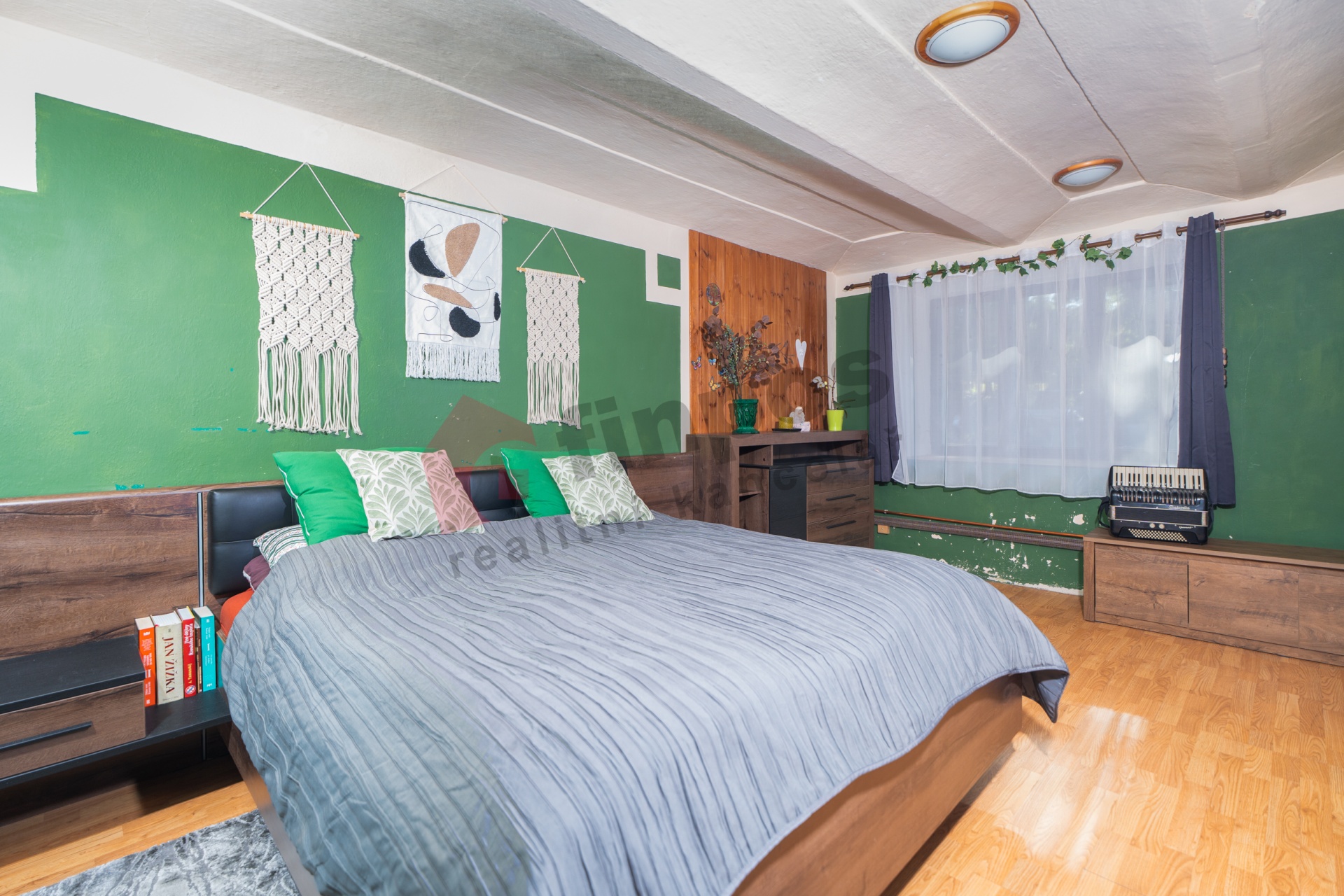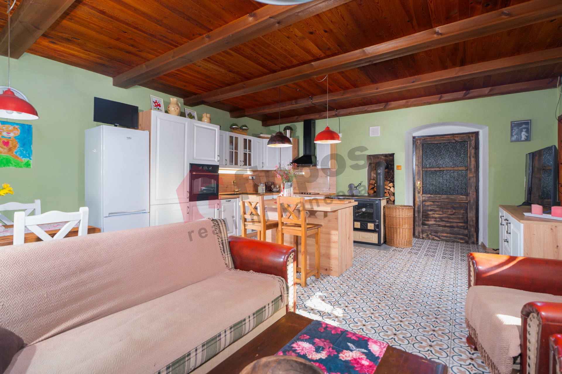 Dispozice domu: zádveří, navazující na centrální místnost, kde byly majiteli strategicky umístěny 12 kW kamna na dřevěné peletky s teplovodním výměníkem do velmi úsporného systému radiátorů (technologie FOXIS Trubek od výrobce ENERGITECH). Odtud vstup do koupelny s vanou a samostatné toalety. Dále je zde ložnice s prostornými vestavěnými skříněmi. A nakonec velká stylová společenská místnost (obývací pokoj) s novou kuchyní z r. 2023.