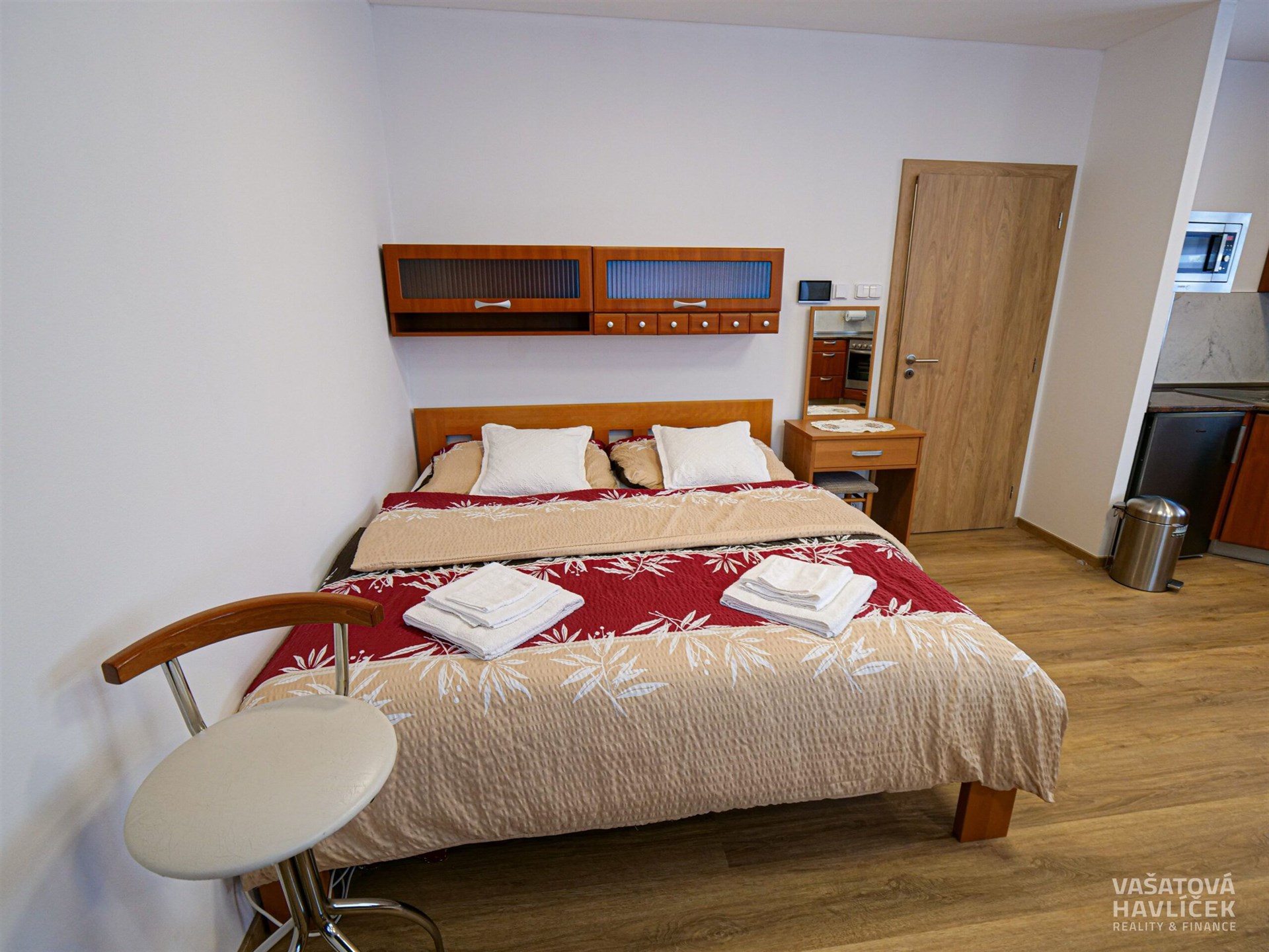> kuchyňská linka s vestavěnými spotřebiči (trouba, sklokeramická varná deska, digestoř, myčka, ledničky), mikrovlnná trouba, rychlovarná konvice, jídelní stůl se židlemi, manželská postel, toaletní stolek se zrcadlem, komoda a TV