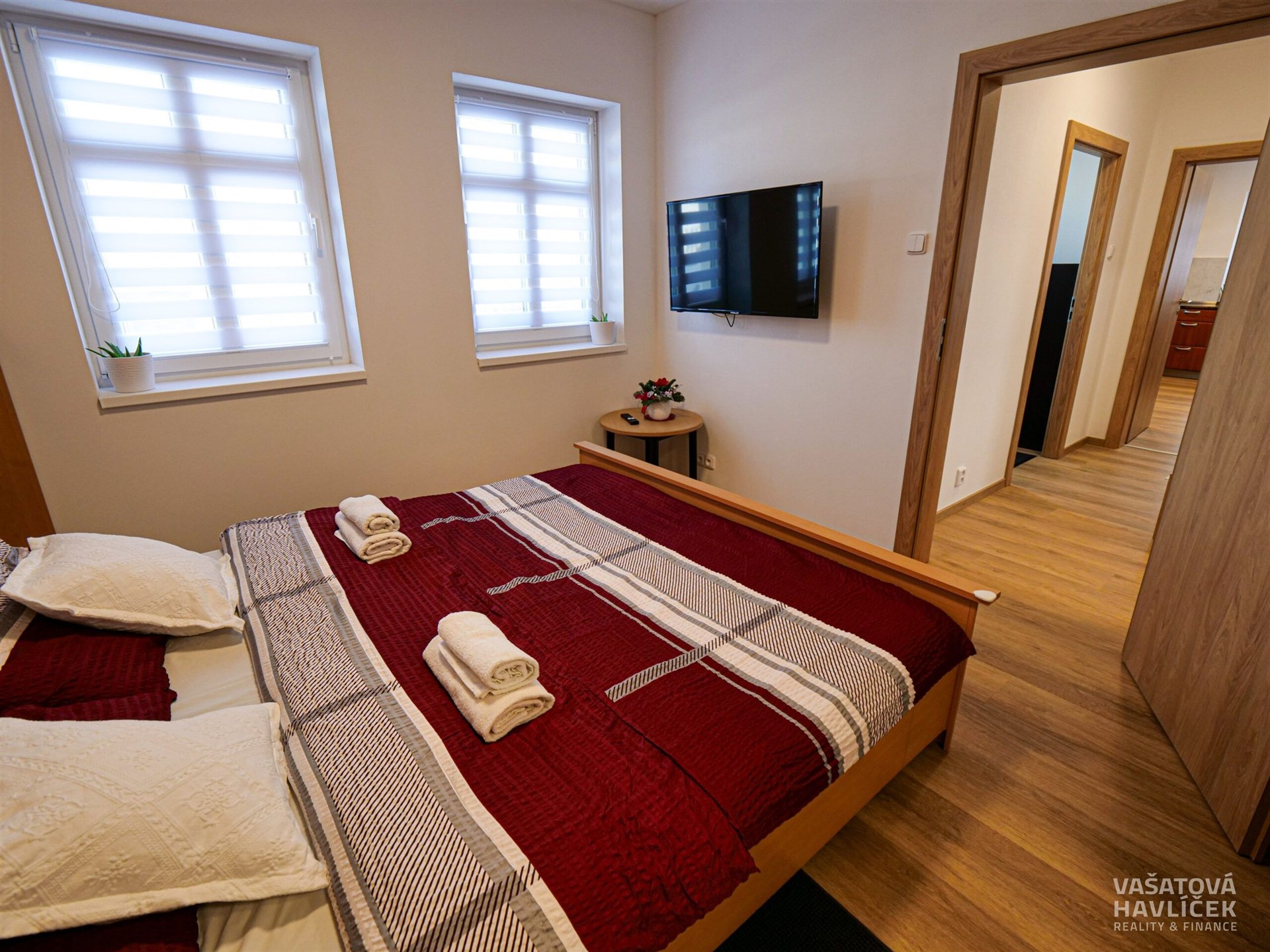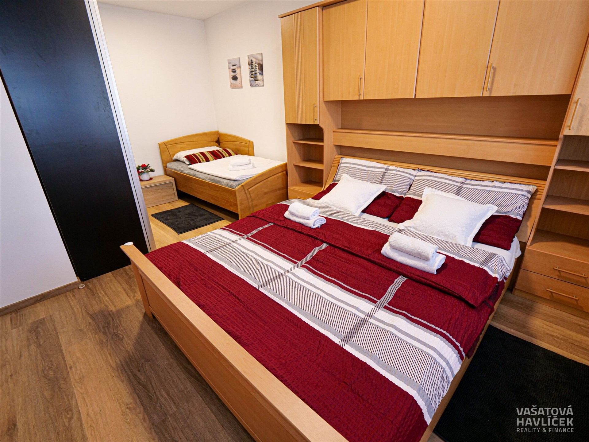 > manželská postel, jednolůžko s nočním stolkem, šatní skříň a TV
