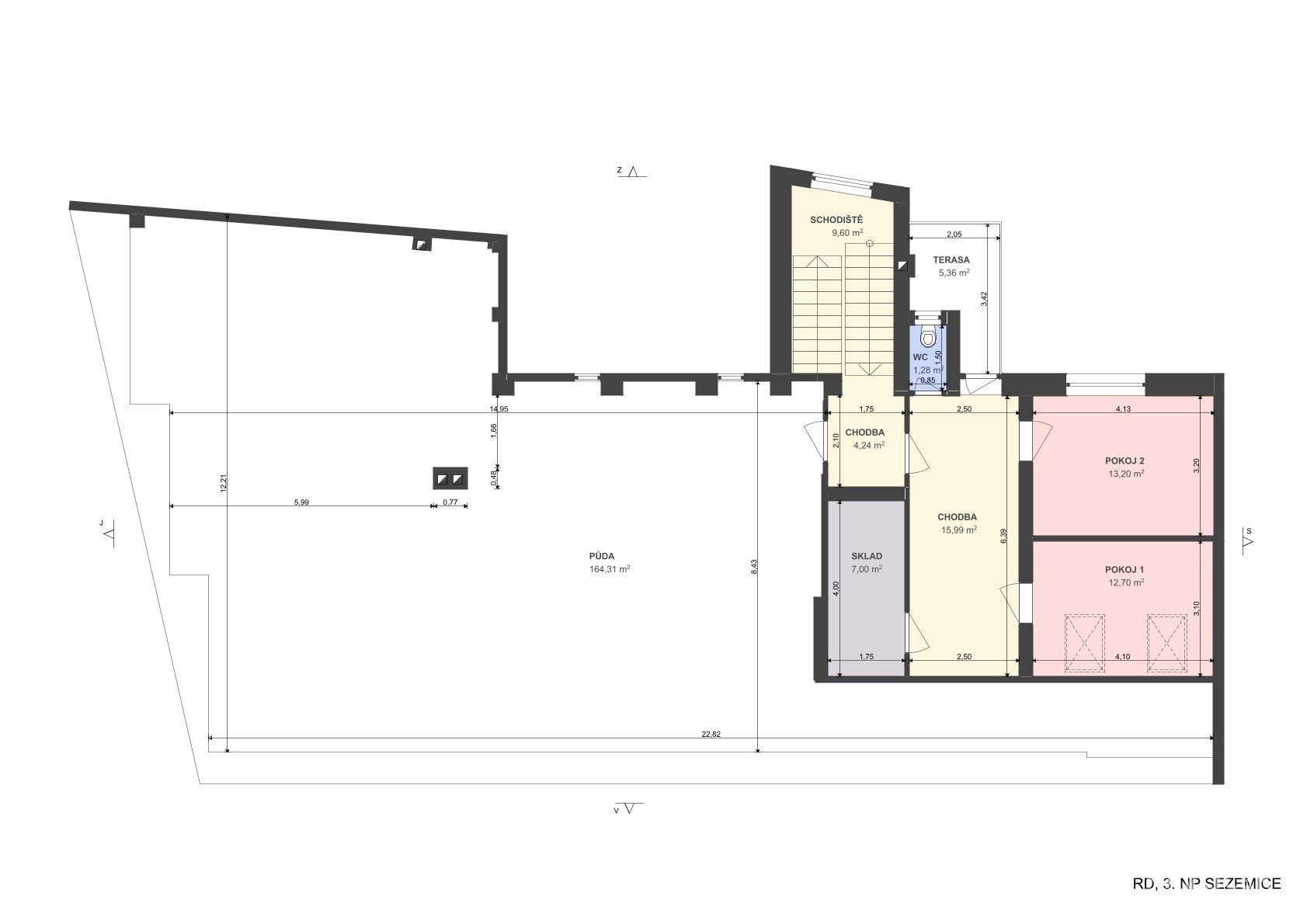 Ve 3NP je půda, která nabízí další možné rozšíření o bytové jednotky. Půdní prostor je o podlahové ploše cca 164 m².