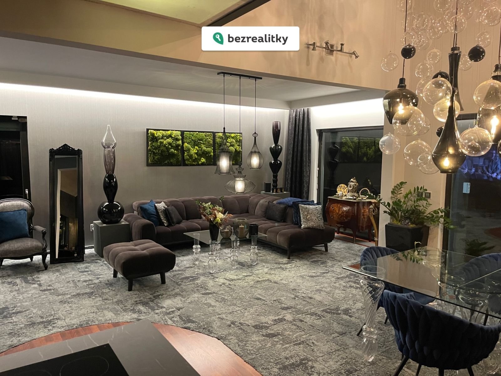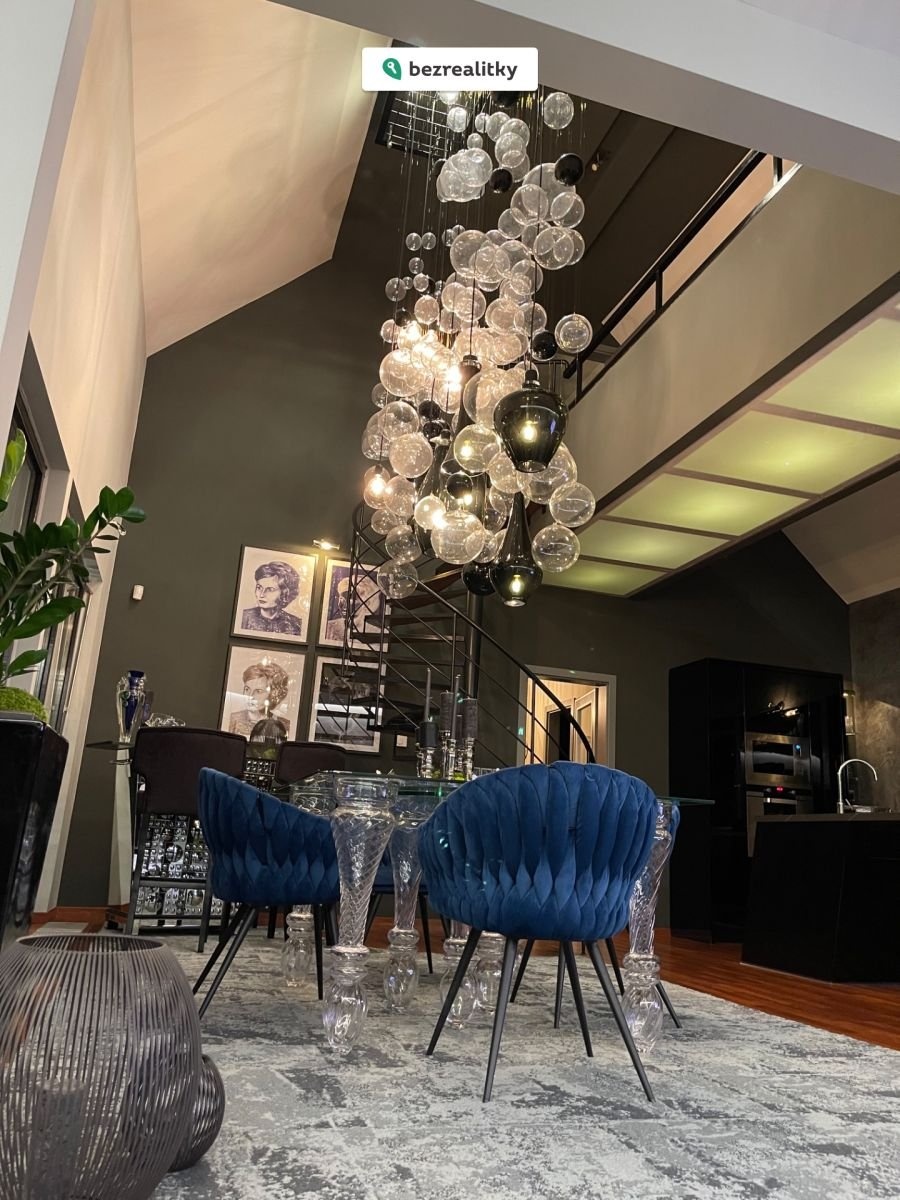 Dominantou přízemí je otevřená obytná část tvořená obývacím pokojem propojeným s kuchyní a jídelním koutem. Kuchyně je vybavena kvalitními vestavěnými spotřebiči a nabízí dostatek úložného i pracovního prostoru. Obývací část doplňuje designový skleněný lustr od světoznámé sklárny. Z obývacího pokoje vedou dva samostatné vstupy na hlavní terasu.