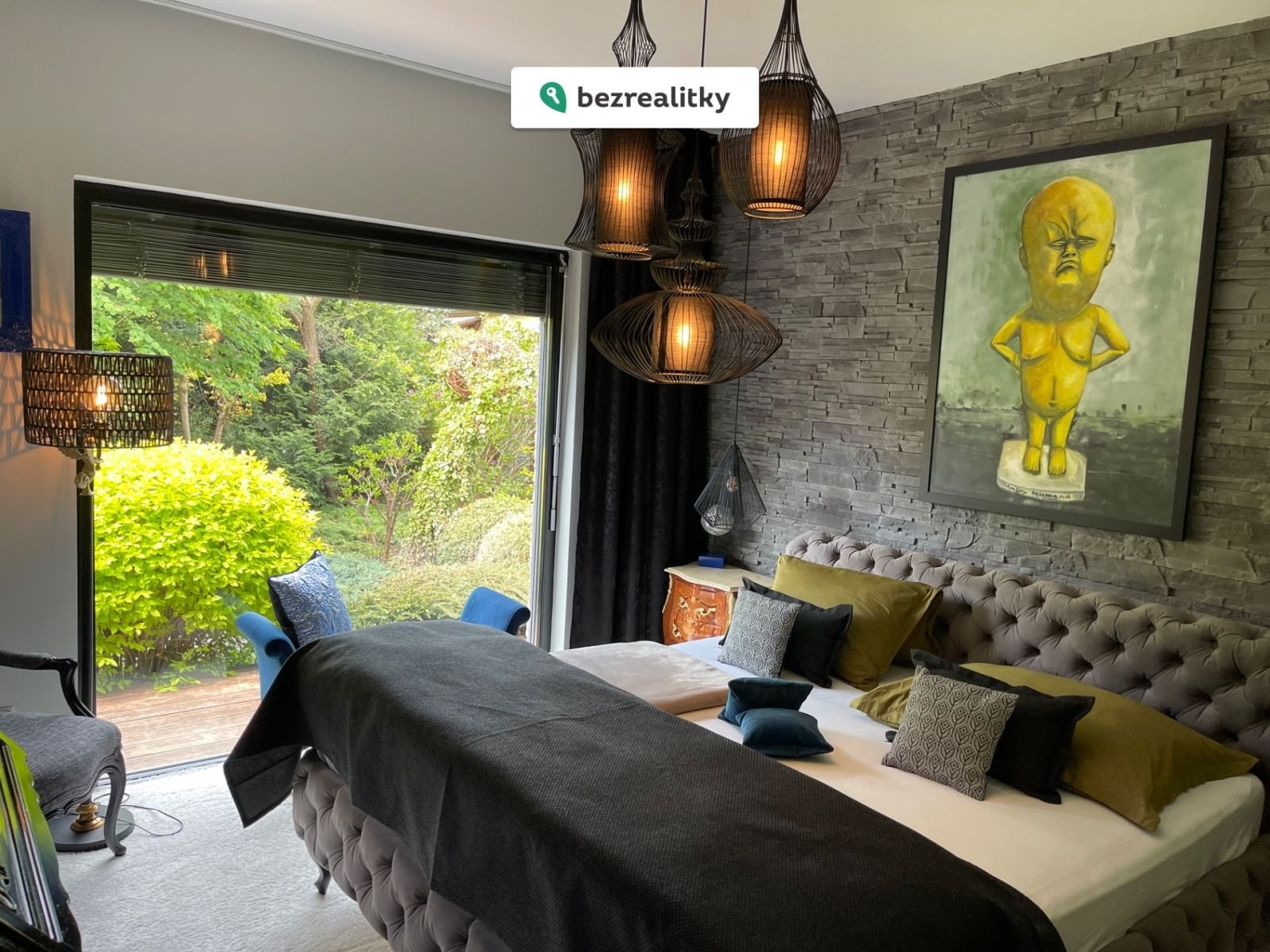 Hlavní terasa je zastřešená a vytápěná, vhodná k celoročnímu využití. Na terasu navazuje vzrostlá, bezúdržbová zahrada, která byla založena a udržována profesionálním zahradníkem. Dominantou zahrady je okrasné jezírko s prvky přírodního kamene a venkovní vířivka. Pozemek je vybaven automatickým zavlažovacím systémem, bezpečnostním a kamerovým systémem a pojezdovou vstupní bránou.