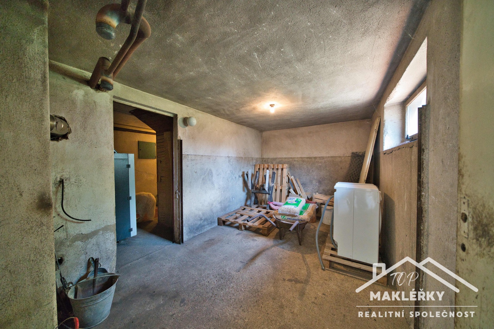 Nemovitost využívá obecní vodovod a kanalizaci. Studna je na pozemku také, ale je nevyužívaná. Plyn zde není. Topení kotlem na peletky ve sklepě. Sklepní část má vstup po betonových schodech a nebo garážovými vraty. Je prostorná a nabízí 2x místnost na uskladnění potravin, místnost na kotel, garáž.