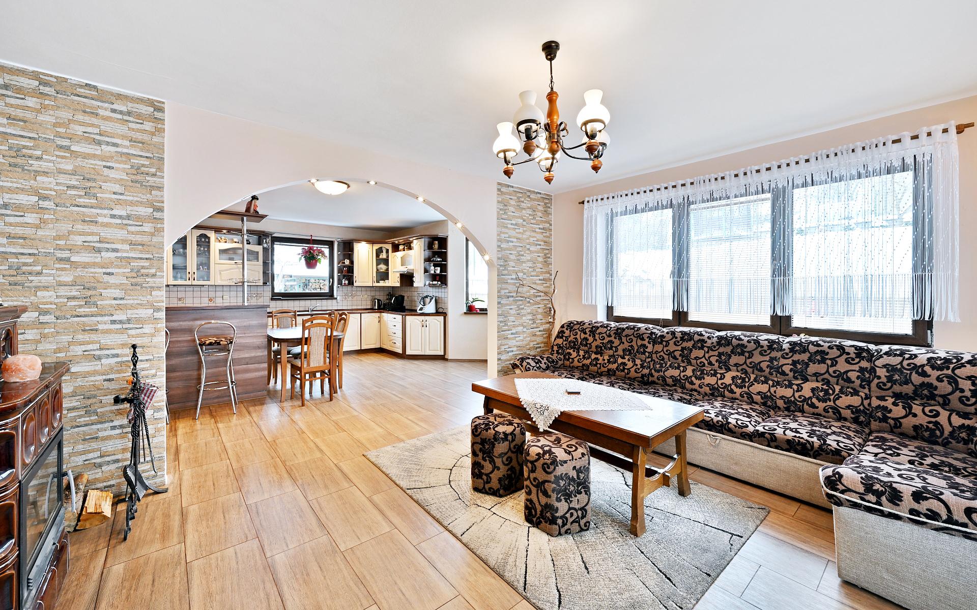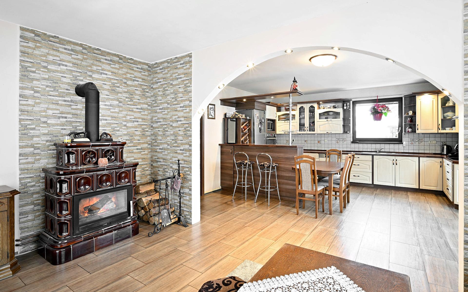 Dominantou domu je reprezentativní obývací prostor s designovými kachlovými kamny značky ABX, která plní nejen estetickou, ale i funkční roli. Obývací pokoj je plynule propojen s kuchyní a tvoří přirozené centrum domu pro rodinný i společenský život.