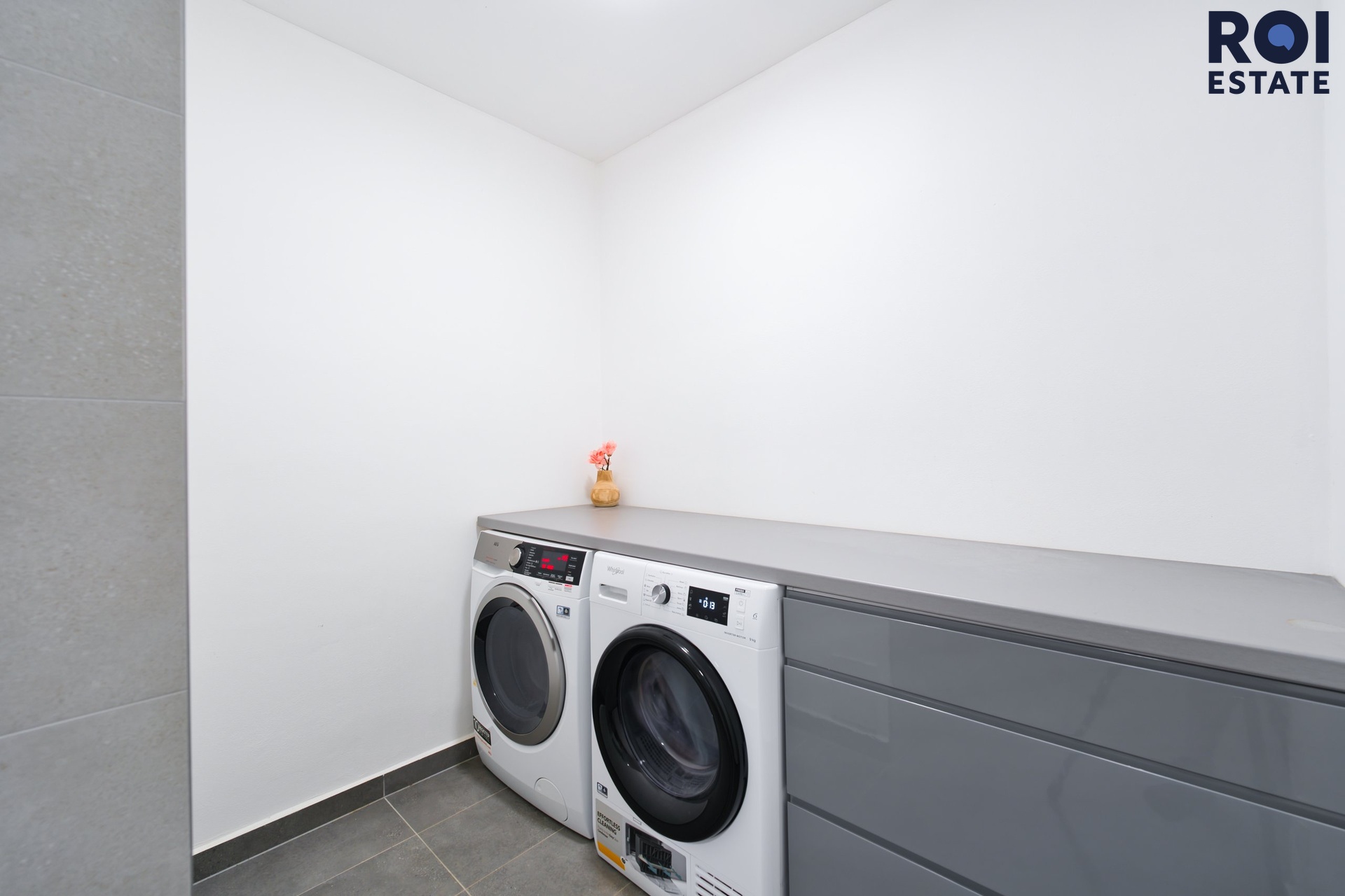 - moderní koupelna s vanou, sprchovým koutem a prostorem pro pračku a sušičku,