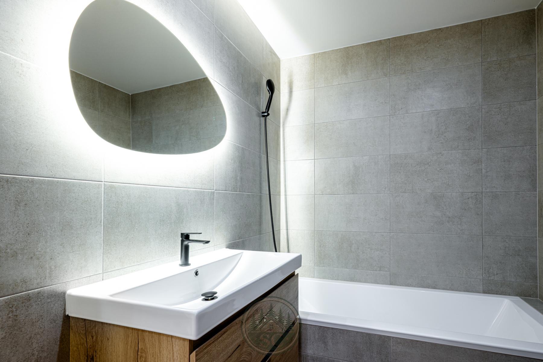 Zasklená lodžie má položenou dlažbu v dekoru dřeva a poskytuje další příjemný prostor k posezení. Koupelna je laděna do kombinace šedých obkladů a dlažby v dekoru dřeva, vybavená vanou, velkým umyvadlem se skříňkou, podsvíceným zrcadlem a připraveným prostorem pro pračku a sušičku. WC je samostatné, ve stejném designu, osazené závěsným systémem Geberit. Koupelnu a toaletu odděluje předsíň s elegantním podsvíceným zrcadlem.
