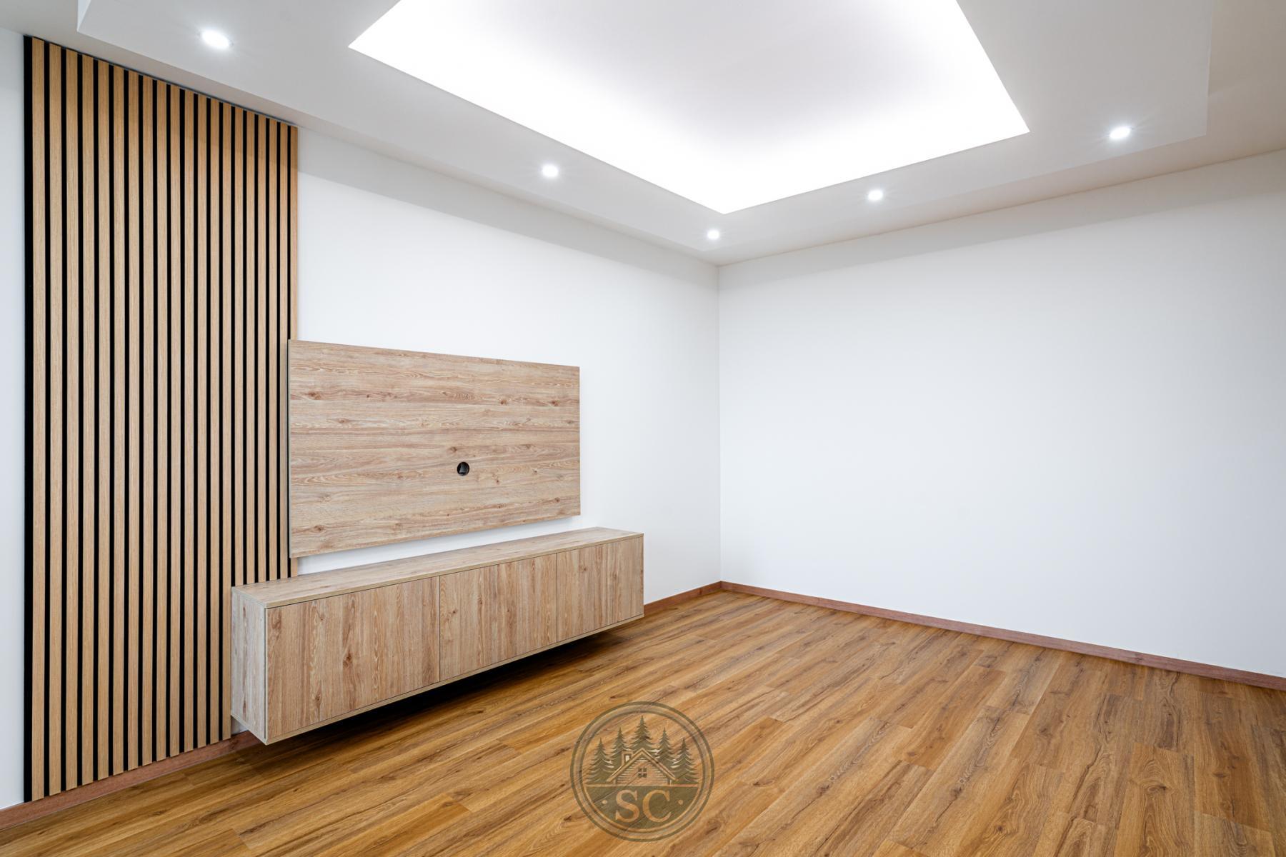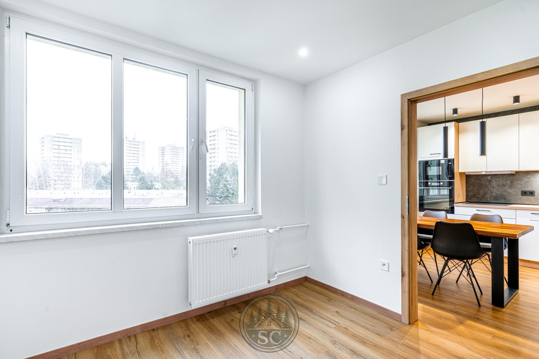 Kvalita rekonstrukce je vidět na první pohled - celý byt má nově vyrovnanou podlahu pomocí nivelace a položenou kvalitní vinylovou krytinu, vyměněny byly všechny dveře včetně zárubní a prostor působí moderně a velmi čistě už při vstupu. Obývací pokoj se zasklenou lodžií nabízí moderní obývací stěnu s přípravou na TV, doplněnou podsvícením s možností regulace intenzity pomocí ovladače. Osvětlení obývacího pokoje bodovými svítidly umožňuje přepínat mezi teplým a studeným tónem světla, což platí také pro druhý pokoj. V pokojích jsou instalovány moderní dotykové vypínače, které umocňují nadčasový styl rekonstrukce.