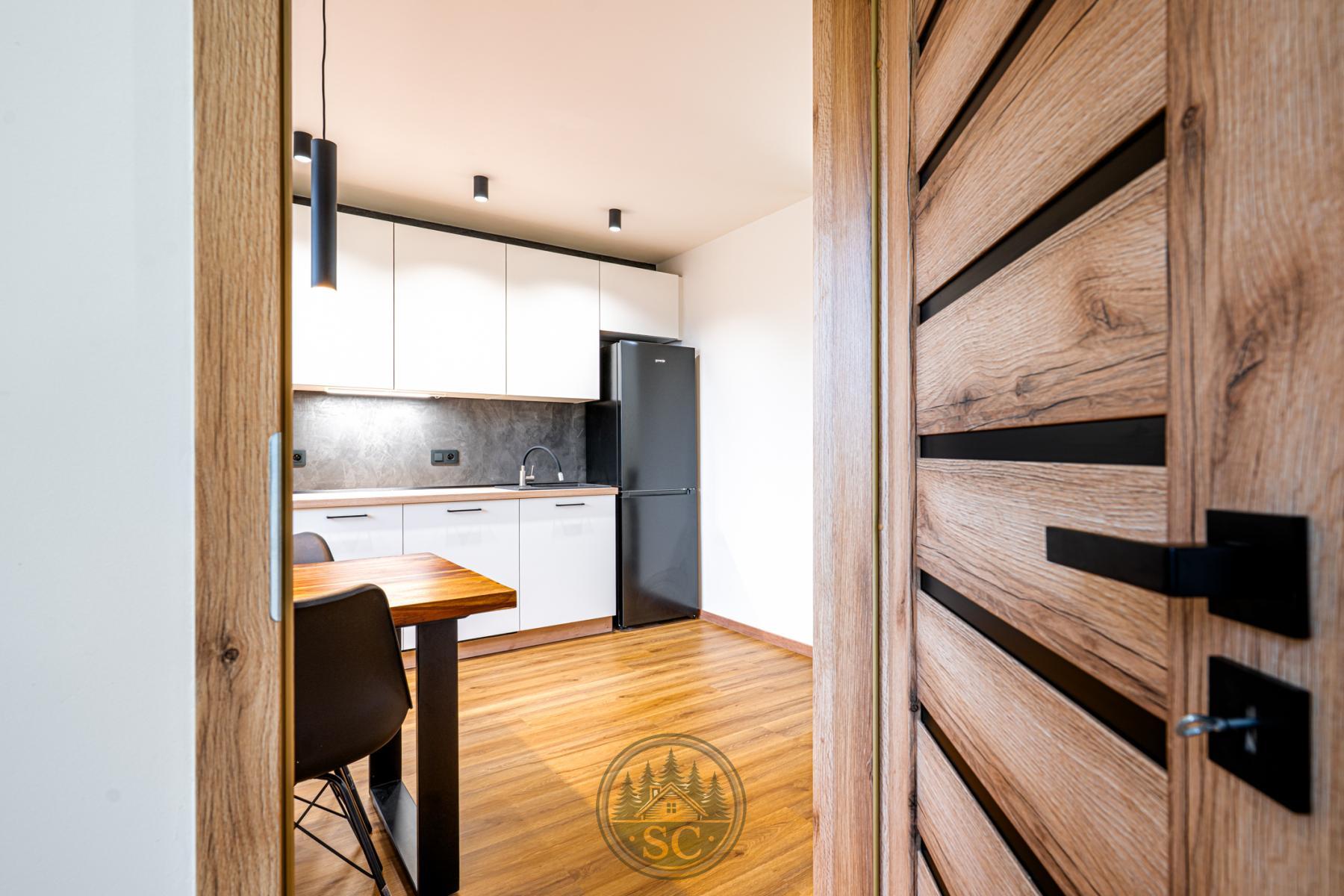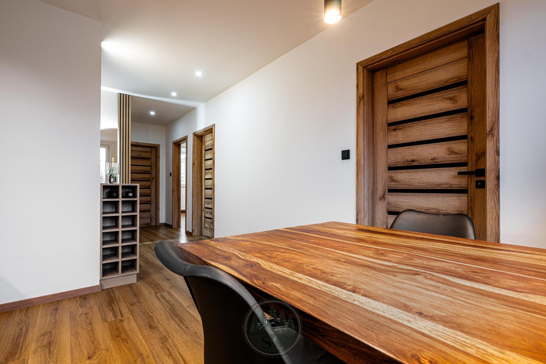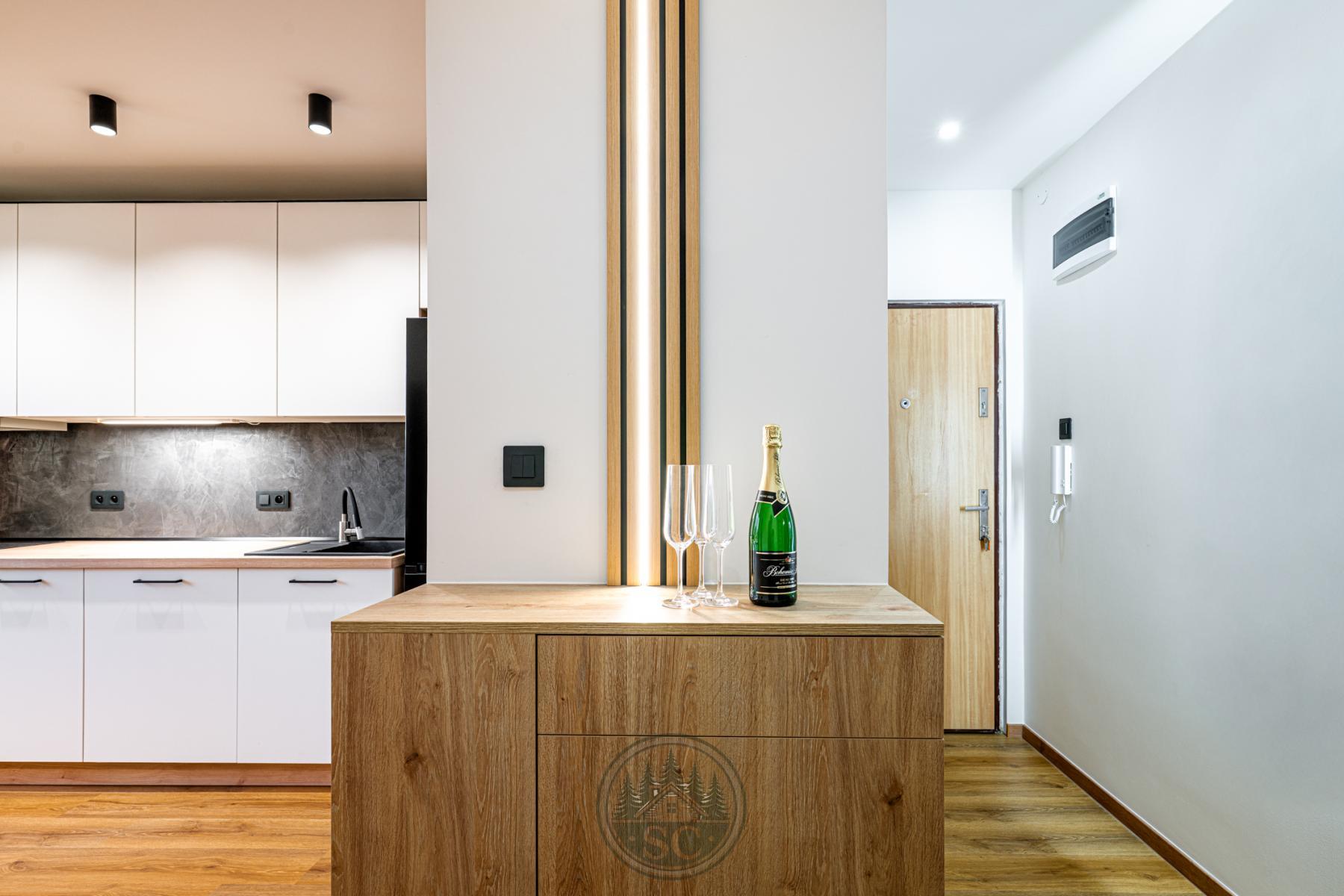 Hned po vstupu do bytu vaši pozornost upoutá nádherná kuchyně, která je skutečným srdcem celého domova. Dominantou prostoru je jídelní stůl z masivu se židlemi, kolem kterého je navržena elegantní kuchyňská linka na míru. Kuchyně je vybavena indukční varnou deskou, vestavnou troubou, mikrovlnnou troubou, myčkou a volně stojící lednicí, takže nabízí plnohodnotný komfort i moderní vzhled. Součástí kuchyně je také stylová komoda s integrovanou vinotékou, nad kterou je umístěn dřevěný dekor s podsvícenou lamelou. Tento prvek vytváří večer krásné ambientní osvětlení. Nad jídelním koutem jsou instalována designová světla navržená tak, aby neoslňovala, a před kuchyňskou linkou jsou samostatná stropní světla pro perfektní viditelnost při vaření.