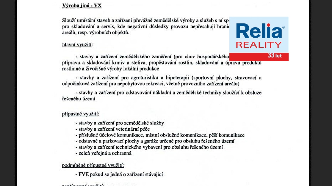 Prodej pozemků není nákupem FVE podmiňován. Pokud se Vaše podnikatelské aktivity neslučují s aktuálním využitím, bude pozemek v roce 2030 volný a FVE bude demontována. Aktuální územní plán určuje tyto pozemky pro výrobu a skladování (VX – výroba jiná). V minulosti byl již vypracován požadavek na změnu územního plánu na plochy pro bydlení, ale podle aktuálních potřeb obce byla tato žádost zamítnuta. Je otázka, zda se v budoucnu situace nepřehodnotí. Dokumentace k žádosti o změnu územního plánu je k dispozici v rámci kupní ceny. Nejenom vlastníci těchto pozemků by změnu územního plánu uvítali, takže existuje i možnost zásadního zvýšení atraktivnosti a ceny.