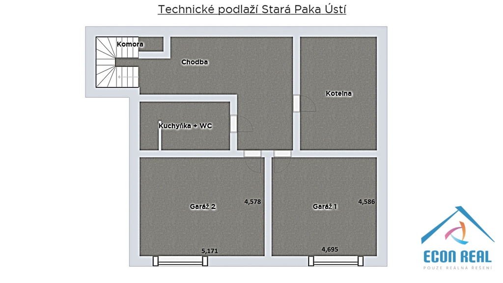 1PP slouží jako technické zázemí: dvě samostatné garáže s novými vraty, technická místnost, prádelna a též kotelna.