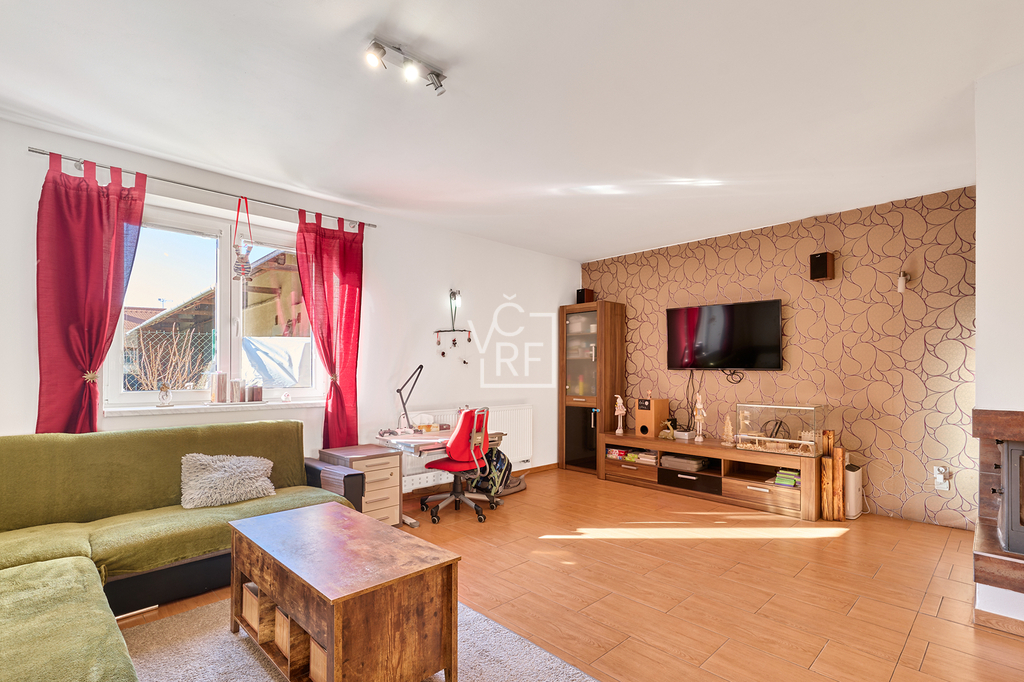 Přípojky: el.230/400V, voda a kanalizace obecní, další zdroj vody z vlastní studny, vytápění a ohřev TUV plynovým kotlem (v přízemí podlahové vytápění), dále lokální vytápění krbem na tuhá paliva, TV, net.