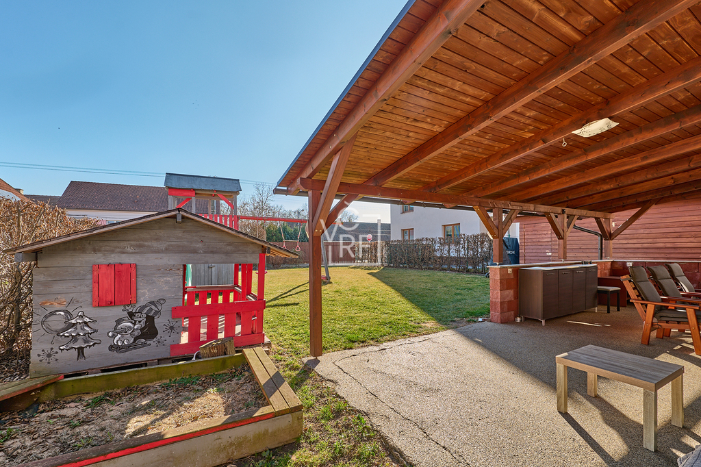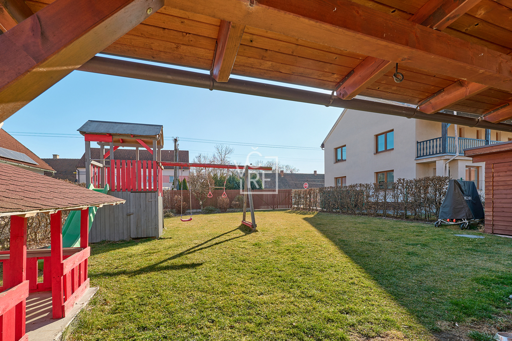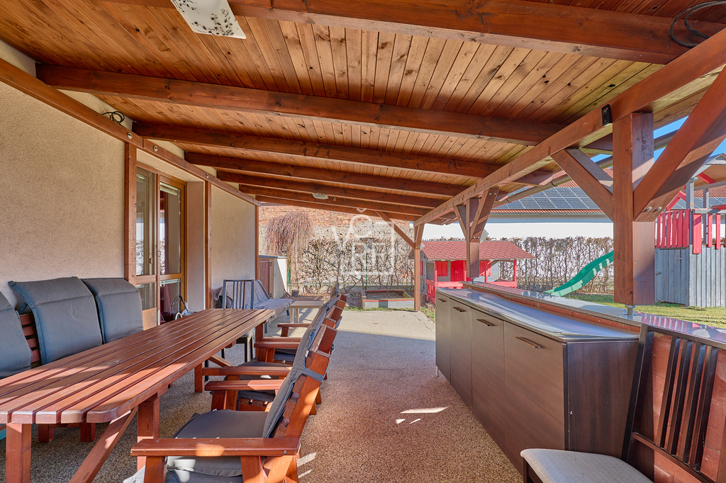 Na navazující upravené a oplocené zahradě se nachází krytá terasa, dřevník, retenční nádrž na dešťovou vodu a studna.
