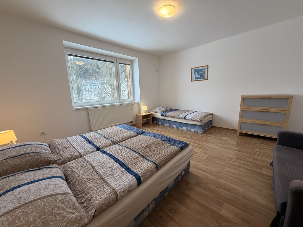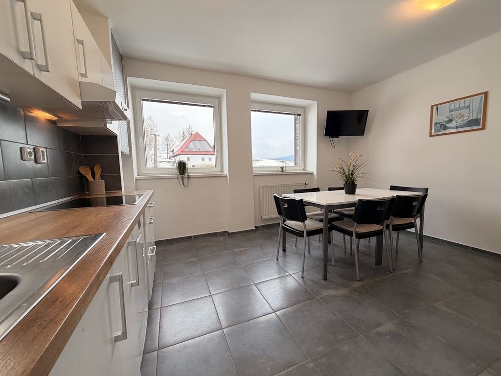 Apartmán je plně vybavený – disponuje vlastní koupelnou, WC i kuchyňkou a je součástí jednoho ze dvou samostatných objektů. Hostům je k dispozici prostorná společenská místnost a po domluvě také infrasauna, což výrazně zvyšuje komfort pobytu i celkovou obsazenost.