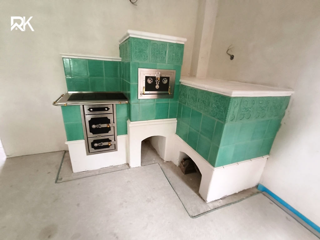Dominantou interiéru jsou nová kachlová kamna s českými pálenými kachlemi, která představují nejen plnohodnotný zdroj tepla, ale i esteticky výjimečný prvek s jedinečným charakterem.