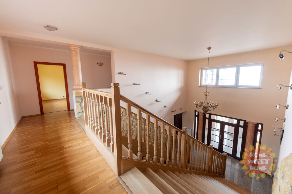Při vstupu do objektu Vás uvítá prostorná hala s impozantním schodištěm. Ideální pro uvítání hostů a vytváření prvního dojmu. Přírodní kamenné obklady na stěnách vytvářejí rustikální a vřelou atmosféru, zatímco dřevěné zábradlí a schody dodávají prostoru přírodní kouzlo a luxusní dojem. Dvojité schodiště doplněné stylovým osvětlením je spojeno galerií, z které je přístup do obou křídel objektu. Prostor je dobře osvětlen přirozeným světlem, které proniká velkými okny s izolačními dvojskly. Vlevo je situován obývací pokoj s jídelnou. Vpravo je z haly vstup do knihovny. Na konci haly je umístěna kuchyně. Vedle kuchyně je vstup do technické místnosti, ve které je soustředěno veškeré technické zázemí domu (tzn. kotel (elektrický), prádelna, rozvaděče atd.). Pod schodištěm je WC a spíž.