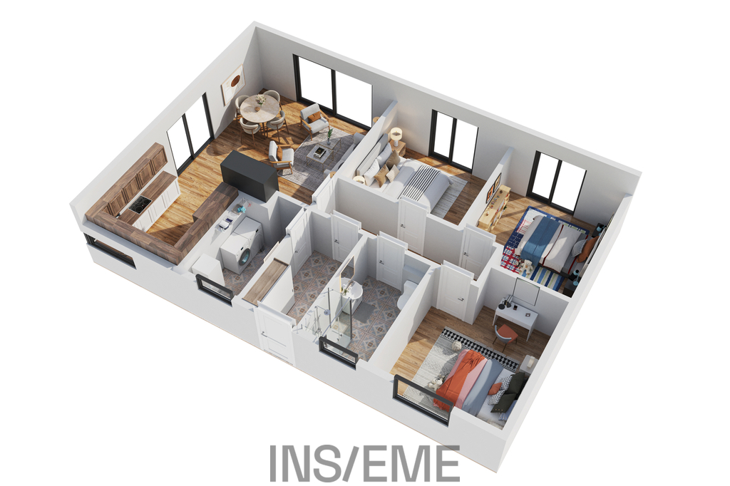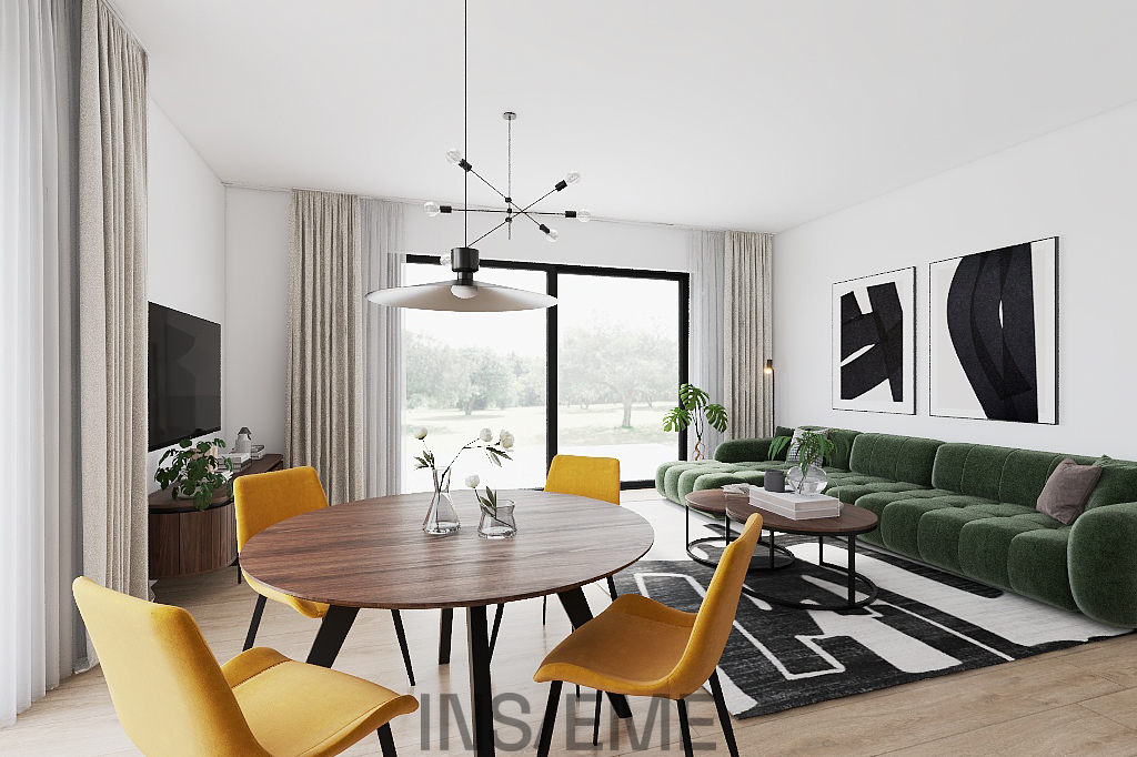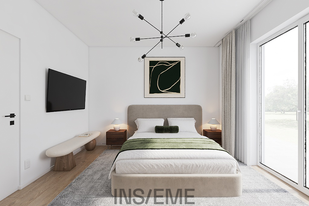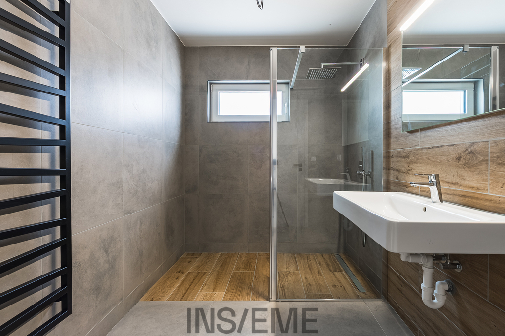 Interiér domu je navržen s důrazem na moderní styl, funkčnost a komfortní bydlení. Otevřený obývací prostor s krbem a kuchyňským koutem je srdce domu - kuchyňská linka byla zhotovena na míru, s důrazem na praktičnost a čistý design. Tři samostatné pokoje zajišťují dostatek soukromí pro každého člena rodiny. Součástí domu je moderně řešená koupelna, která nabízí pohodlné zázemí pro každodenní rodinný provoz. Dominantou prostoru je sprchový kout s bezbariérovým vstupem a skleněnou zástěnou. Koupelna je vybavena závěsným WC, elegantním umyvadlem s velkým zrcadlem.