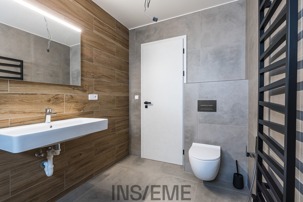 Velkým plusem je samostatná technická místnost. Je zde umístěno kvalitní tepelné čerpadlo značky Vaillant, které zajišťuje celoplošné podlahové vytápění ve všech obytných místnostech. Výhodou systému je i možnost letního ochlazování vzduchu - příjemné klima budete mít zajištěno po celý rok, bez nutnosti klasické klimatizace. Součástí této místnosti je druhé WC s umyvadlem, ideální např. pro hosty nebo při pobytu na zahradě. Nachází se zde i příprava pro pračku a sušičku.