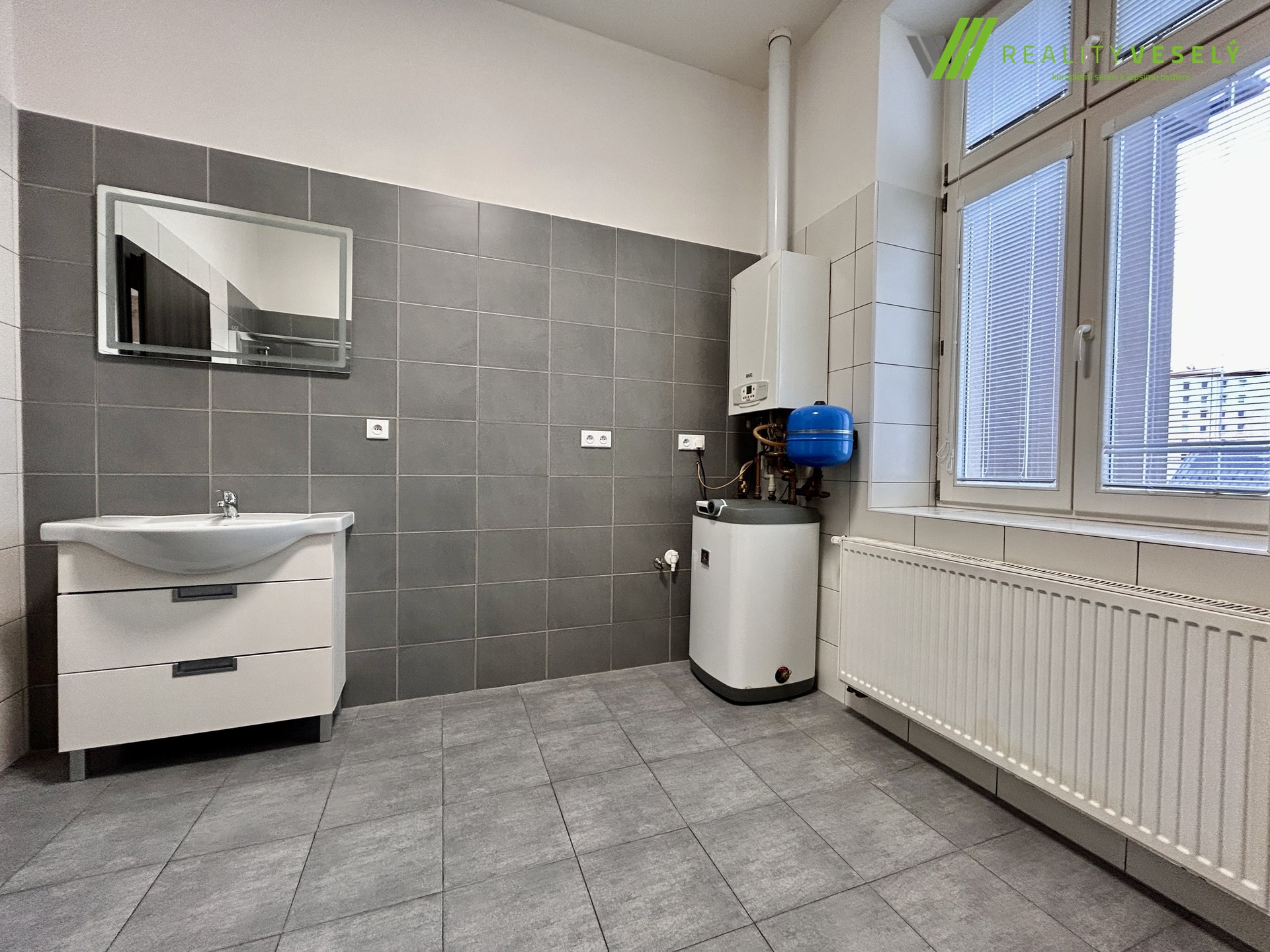 Kuchyňská linka je vybavena elektrickou varnou deskou a troubou, digestoří a lednicí. Prostorná koupelna disponuje sprchovým koutem a vlastním plynovým kotlem. Byt je částečně zařízen – jídelní stůl se židlemi, postel a úložné skříňky.